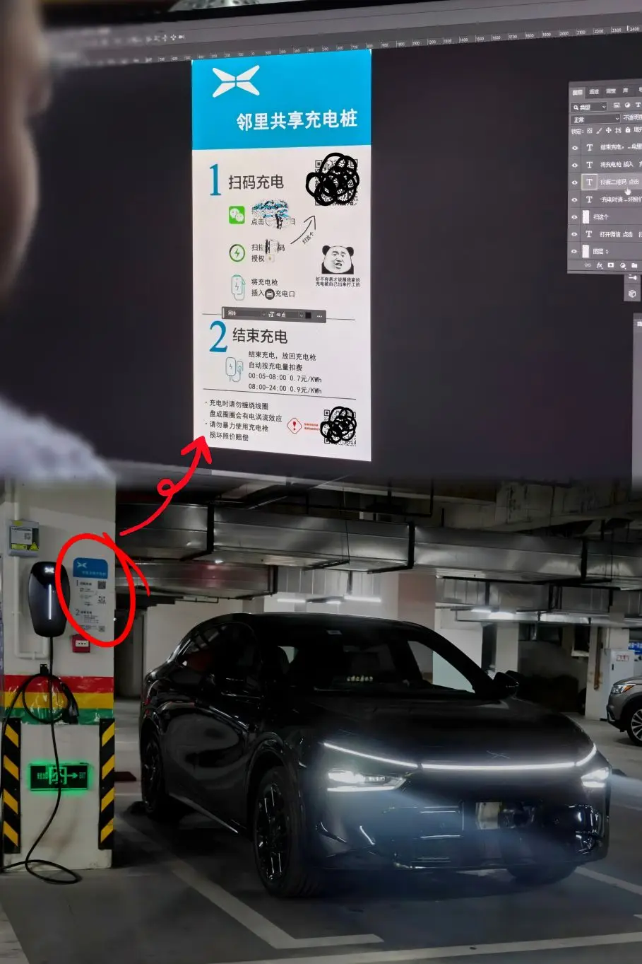 我们觉得共享电桩的模式很有趣,开通了共享电桩,还自己设计了共享电桩指南贴在车位旁✌