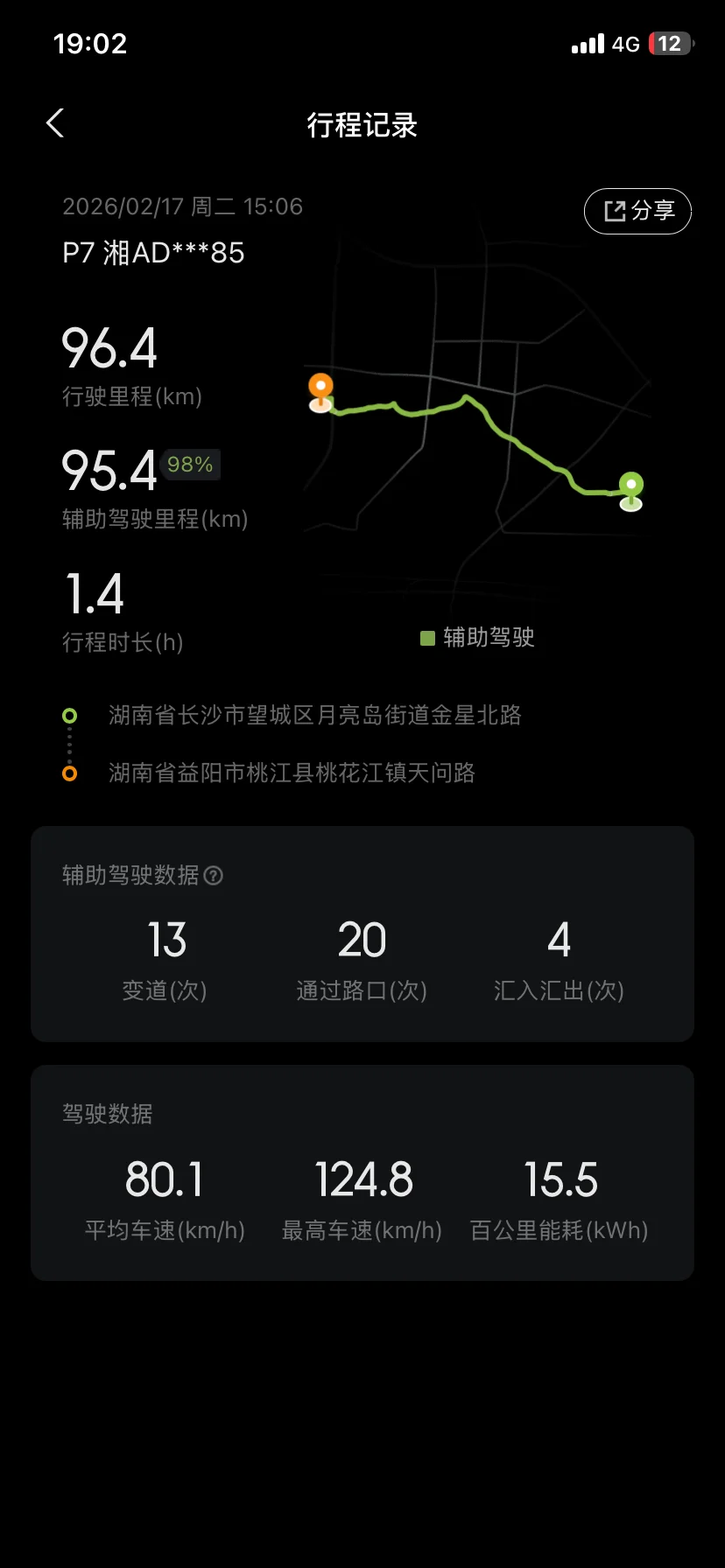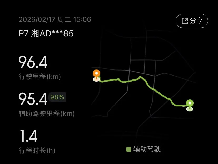 从长沙望城出发,上高速的那一刻,我轻轻拨动两下换挡杆。方向盘微微收紧,仪表盘上灰色的道路标线亮起蓝光——NGP已激活。96.4公里的归途,辅助驾驶跑了95.4公里,占比98%。这意味着我几乎只需要做一个“监督者”,剩下的都交给它。