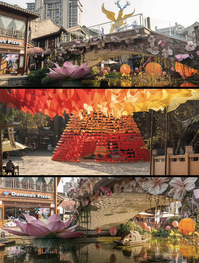 红灯笼、大花灯、金鹿装置… 到处都是红红火火的新年元素,随便拍都是新中式大片!尤其是梧音桥的大花灯,晚上亮起来绝了,站在下面氛围感💯~