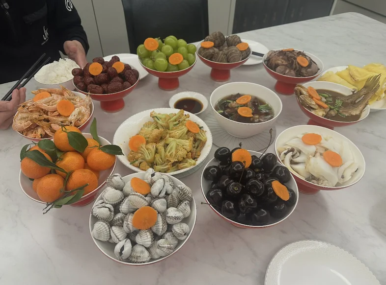 感受温州人的年味少不了除夕夜年夜饭,特色摆盘红碗排开是十全十美,黄鱼上桌是年年有余,鸭舌一抿,便是最浓的乡愁。守岁围炉,灯火可亲,红碗盛着山海鲜味,血蛤、江蟹生鲜灵入味,每碗顶上的胡萝卜片藏着圆满心意。瓯柑清甜,车厘子添喜,满桌烟火皆是团圆。