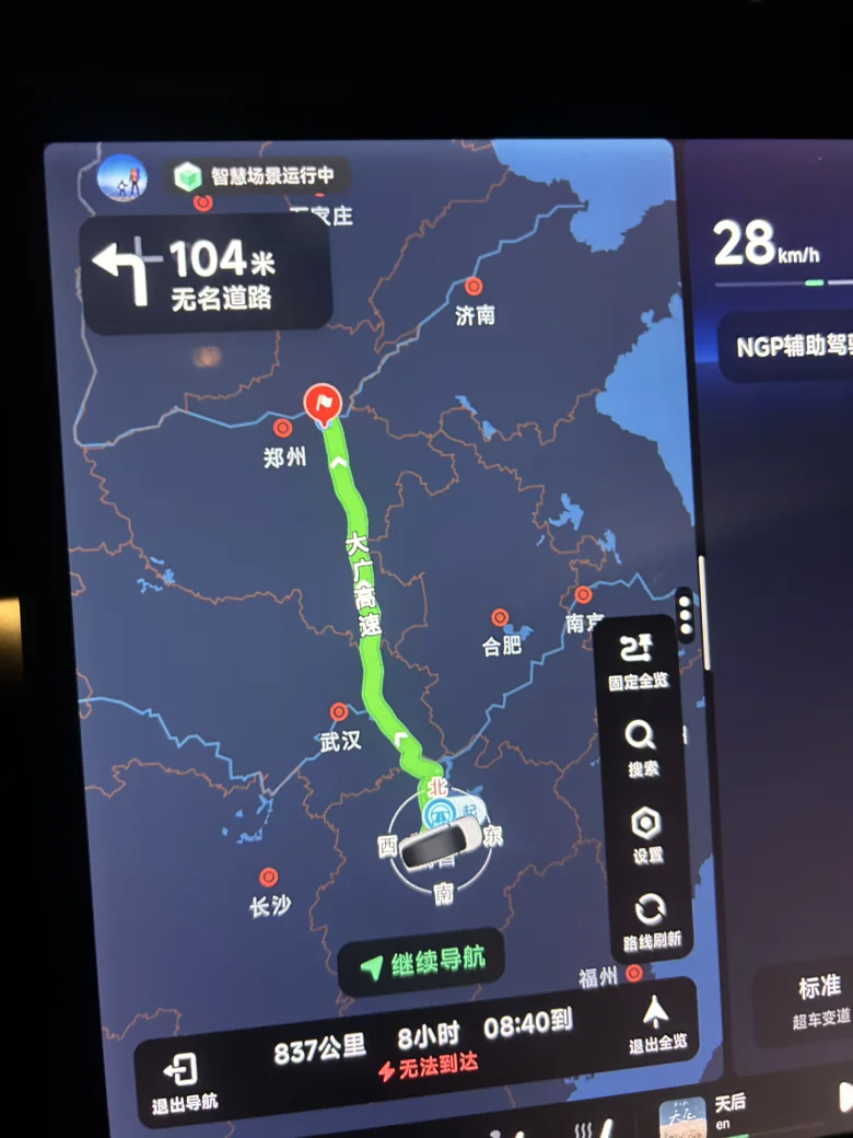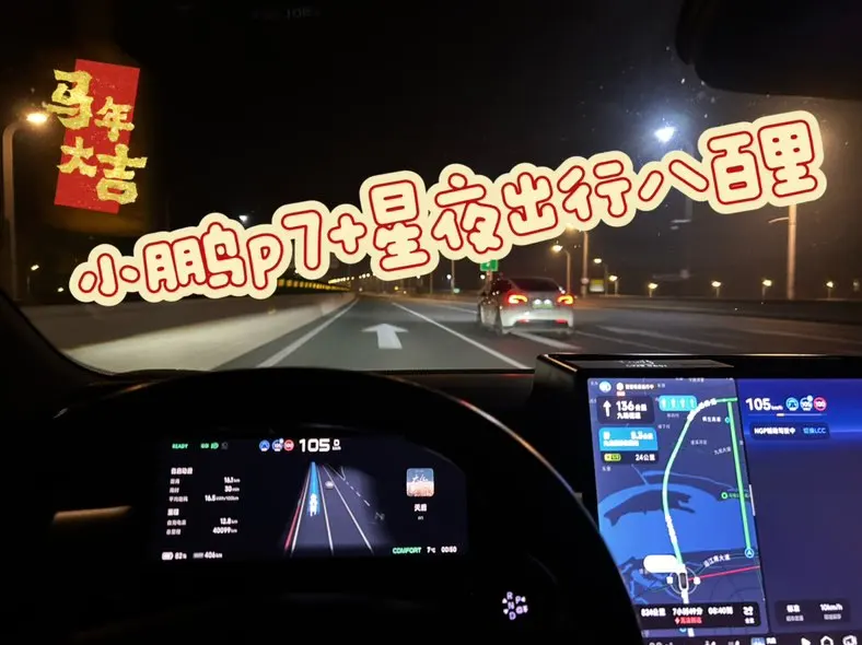 夜色正浓,起手一个NGP。这一路,小p骑着战马,自会带我抵达。稳稳地跟车、变道、汇入汇出。800多公里的智驾里程,100%的智驾占比,哪怕是夜晚,依旧可以让我在大部分时间里都能放松下来,只需要偶尔关注路况。提前预判前方的慢车,干净利落地完成变道;遇到匝道和路口,也会提前减速,避让汇入车辆,小P简直给足了我安全感。有了它,长途不再是枯燥的煎熬,更像是一场轻松的巡航。