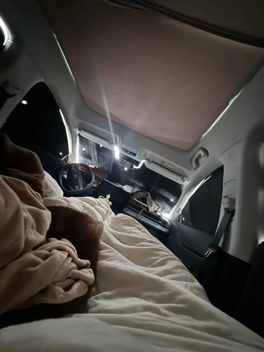 前排放倒在服务区休息,太困了,睡着之后就没有考虑吵不吵的问题了,整上隐私帘,密闭睡觉小空间。