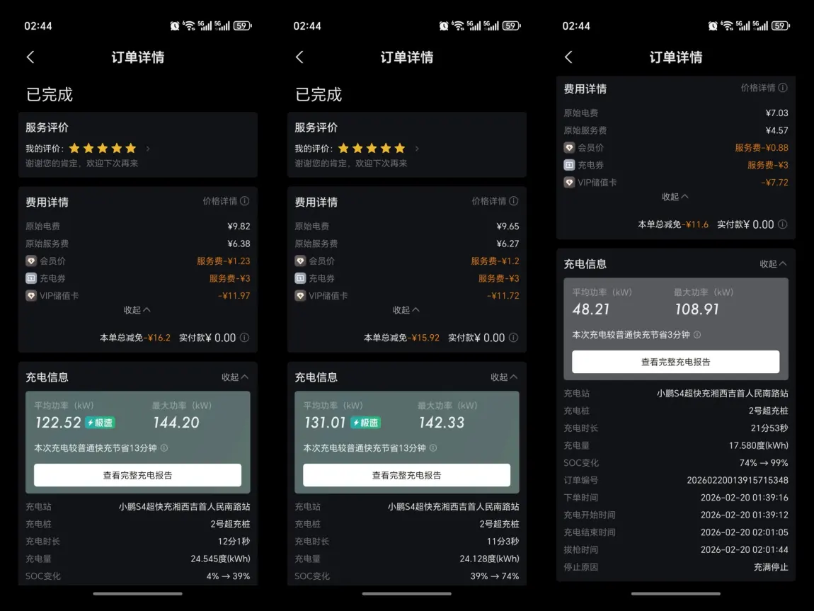 - 此次充电过程,由于小主极限需要使用即将到期的小鹏汽车发放的新春服务费1折券,人为分三次充完。不得不说,小鹏的活动真给力。直接一波怒省9元服务费。峰值电流250A左右,总计用时44分钟。