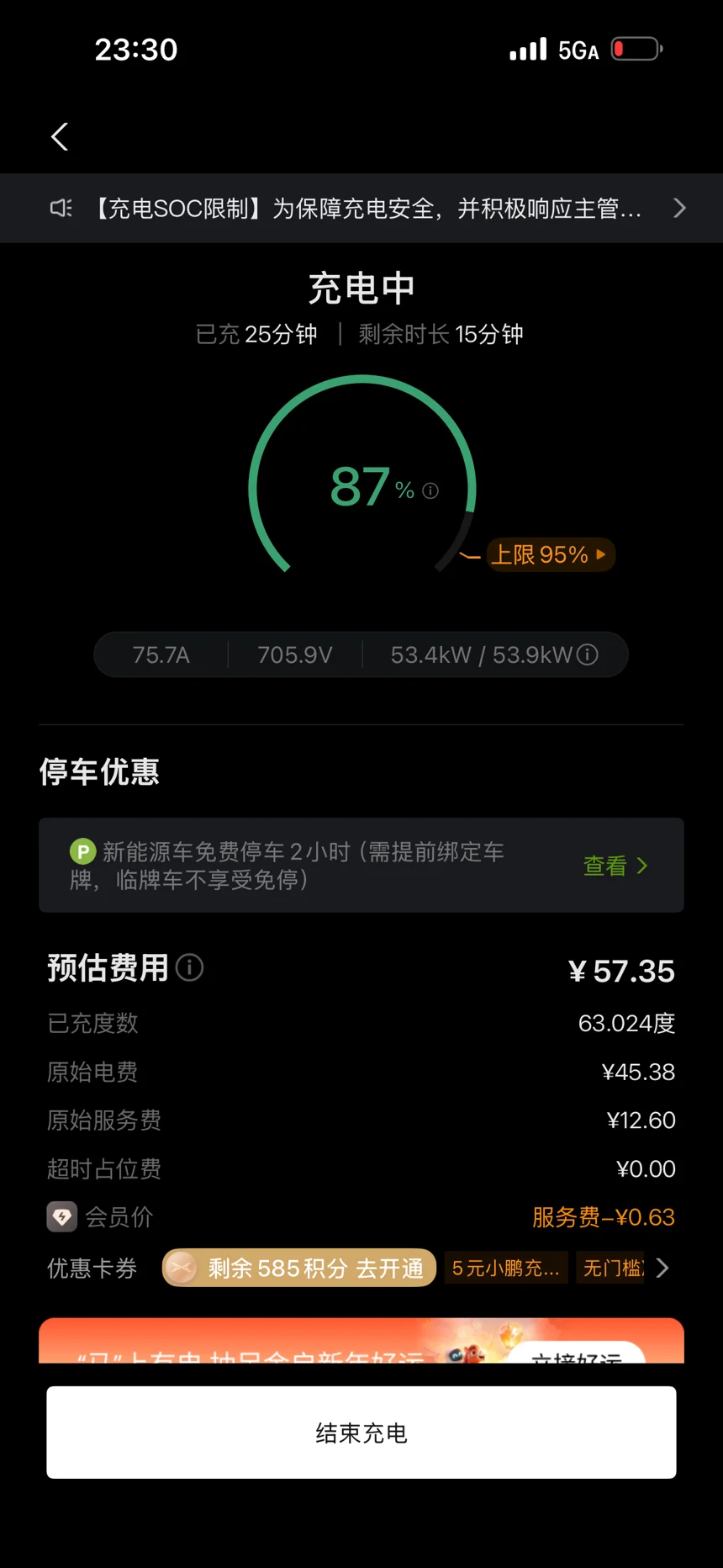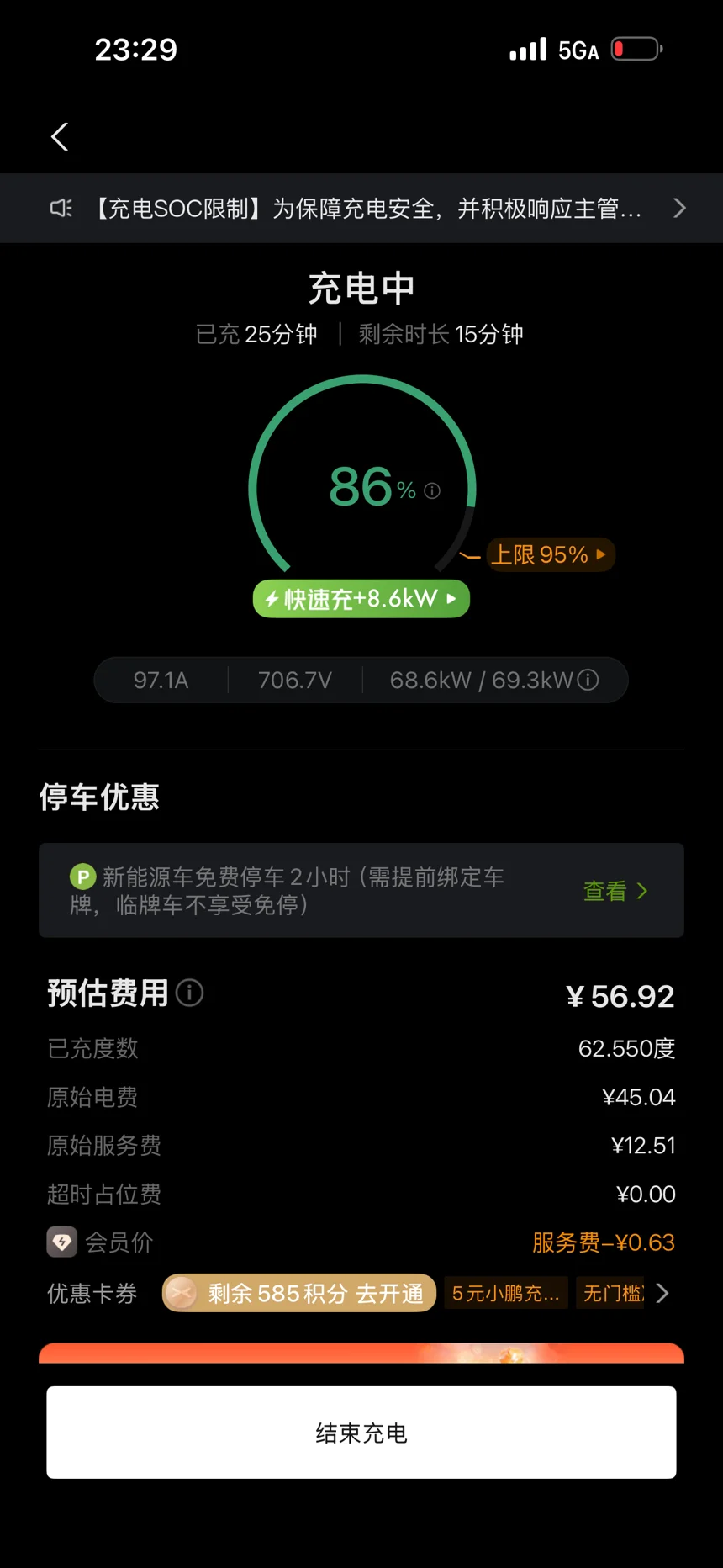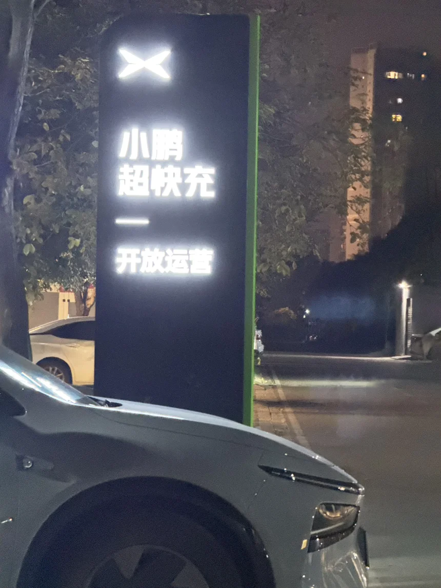 玩到晚上,电量只有26%了,搜索到小鹏超充站,不远,几分钟就到了。插上充电枪,冲到六成多的时候很快,将近260W,只用了十分钟不到,很满意了。