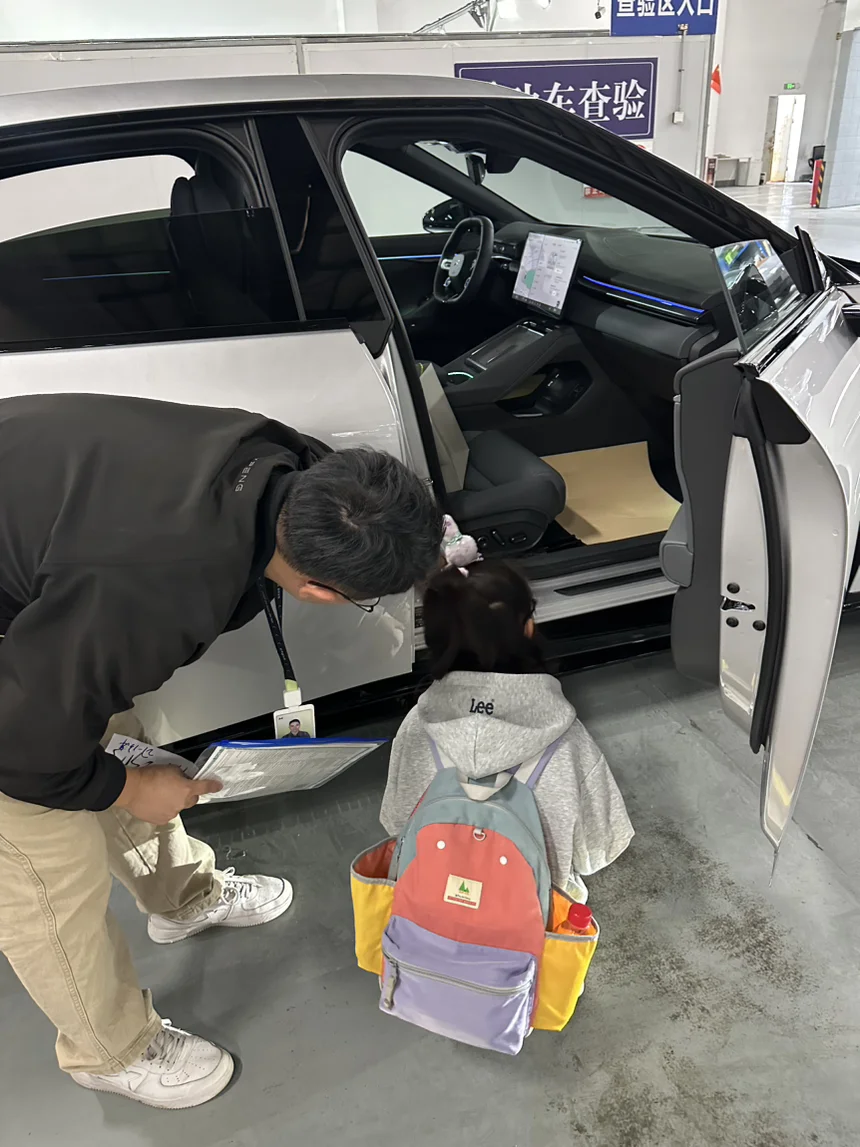 👉到了广州黄埔交付中心,工作人员把我们带到新车进行验车。看到了新车,娃非常高兴,带着满满的责任感与自信帮忙一起验车,从看车架号,轮胎,五金,车底,每一件事都非常认真。这对于孩子来说,也是一个有趣的实操项目。验车过程中,哪里有问题,有清洁不到位的地方,可以随时告知验车工作人员,他会及时处理,这点很赞👍