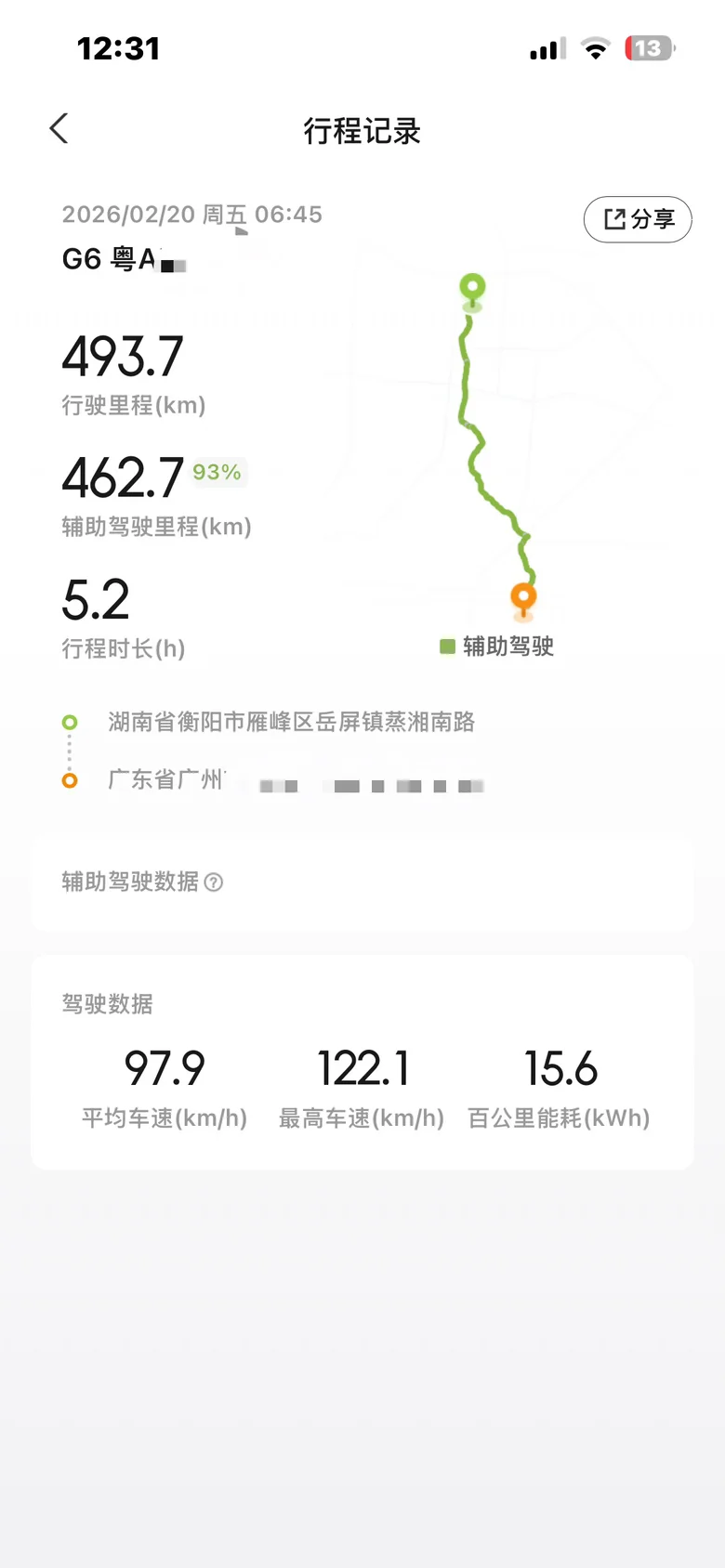 果然,到了广东湖南交界,显示达到目的地剩余8公里!最终到家后,显示剩余38公里(回家后把家充插上,夜晚谷电时间自动补能!)。回程的平均速度98,能耗是15.6度电每百公里!这个能耗控制真的很厉害了,折算下来这个速度下,高速续航达成率83%!!!!