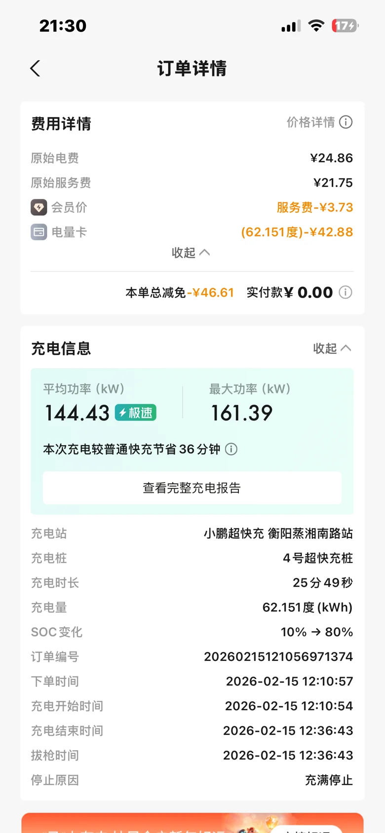 去的时候,衡阳下高速,在小鹏自己的充电桩充电,使用赠送额度,0花费。