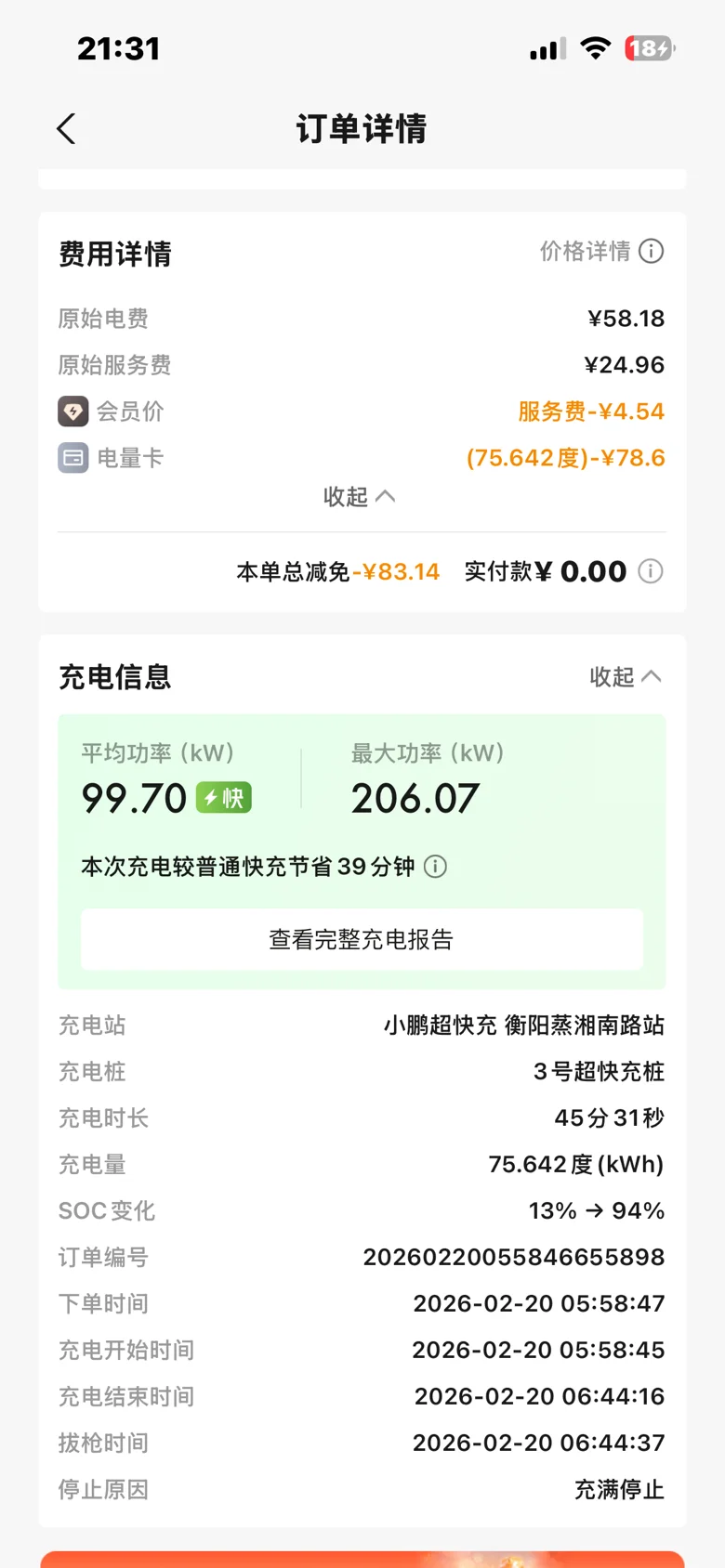 最后回程同样在衡阳小鹏自营充电: