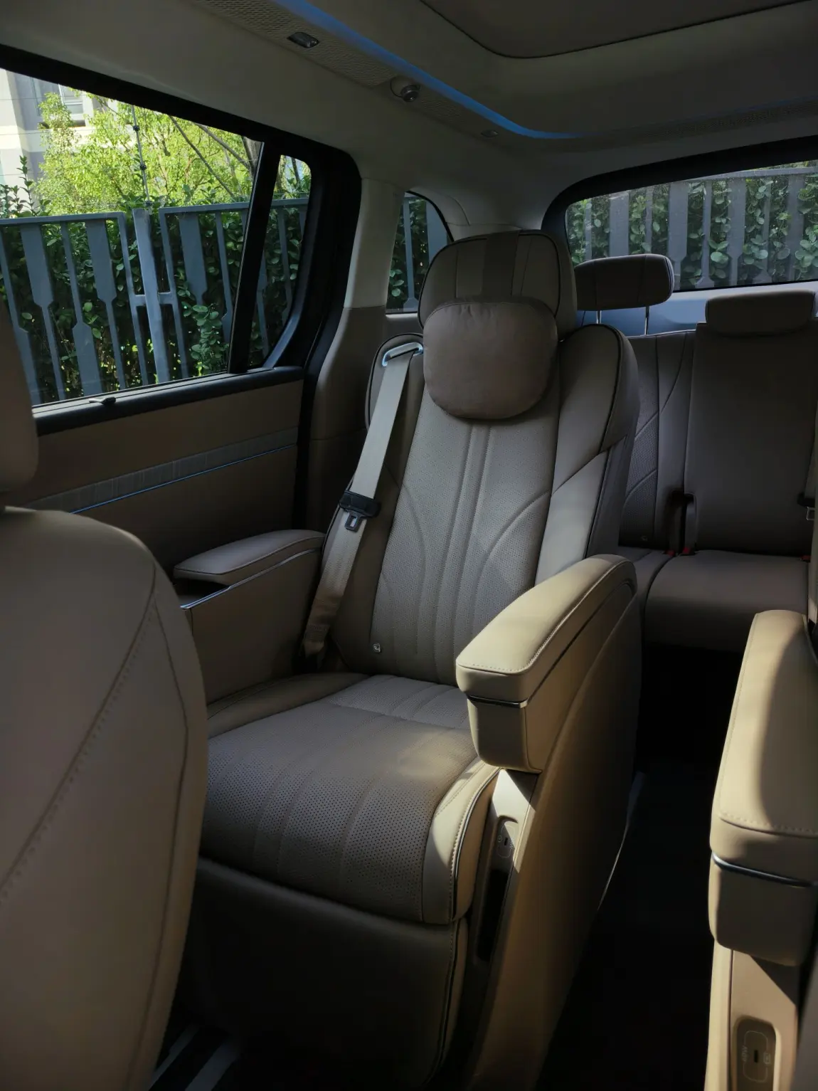 3160mm轴距+2+2+3布局,三排都能坐成年人不挤腿。180mm超宽中央过道,老人孩子上下车超方便。二排零重力座椅带按摩/通风/加热,长途像移动头等舱。