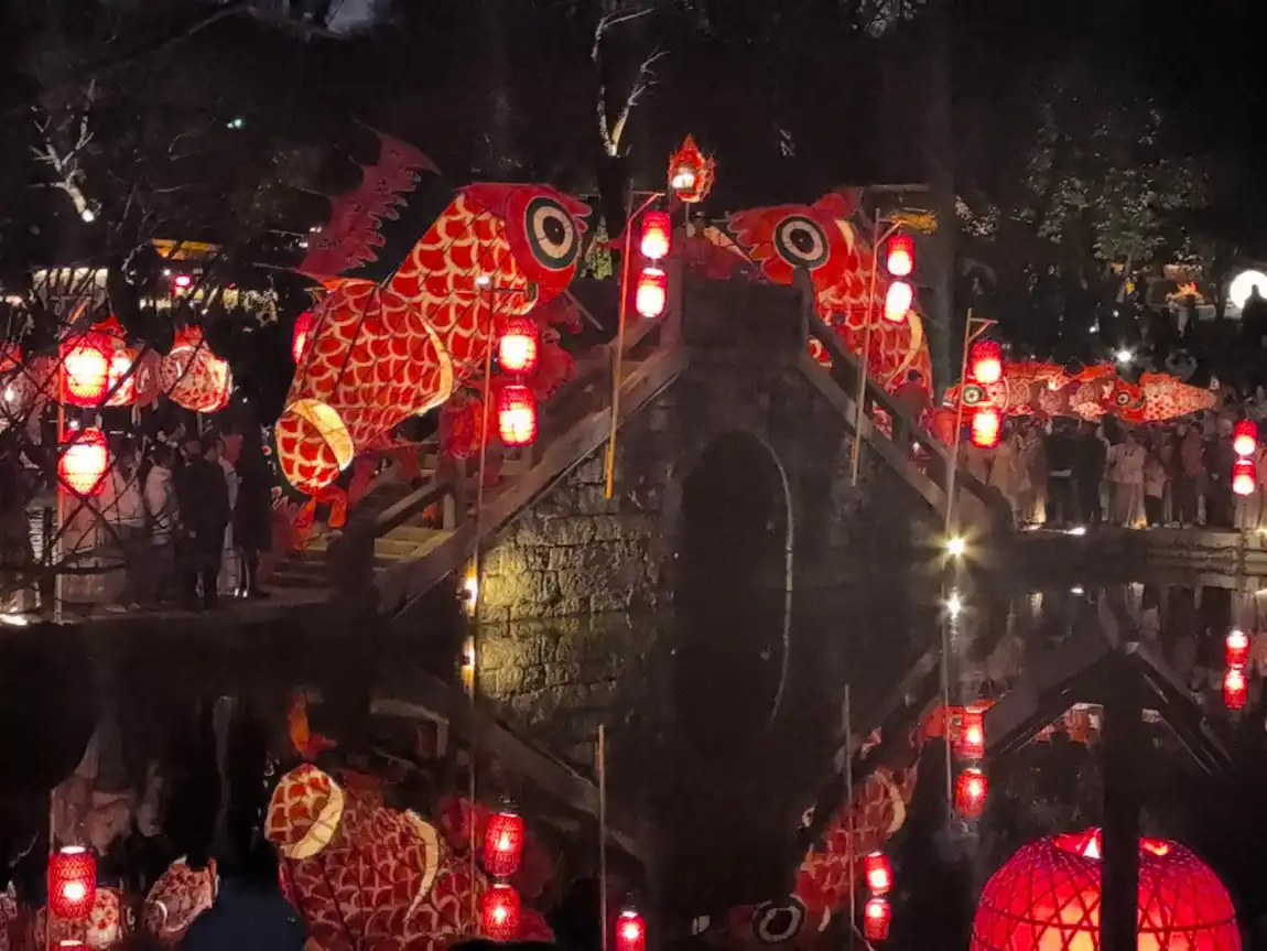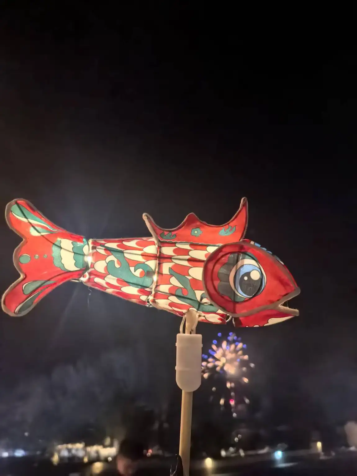 晚上,最期待的鱼灯表演终于登场。巨大的鱼灯在夜色中缓缓游动,鳞片闪烁,仿佛从历史深处游来。孩子们举着小鱼灯穿梭在人群中,欢声笑语与古村的静谧交织,构成了一幅绝美的画面。