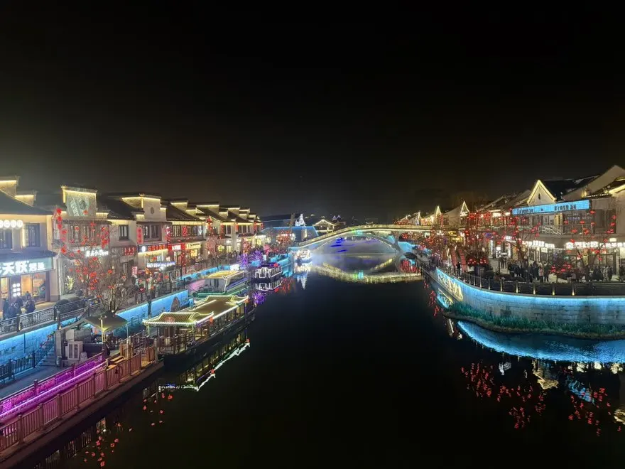 上午在荡口古镇,看水巷纵横,古桥卧波,机器人醒狮新潮又有趣,非遗手作与特色小吃让人驻足。午后转场南长街,古运河畔灯火初上,青砖铺就的街道文艺又温柔,文创小店、河畔茶座、游船灯影,把江南的夜衬得格外浪漫。