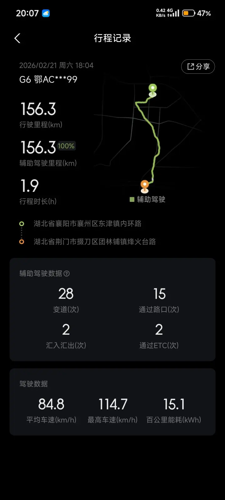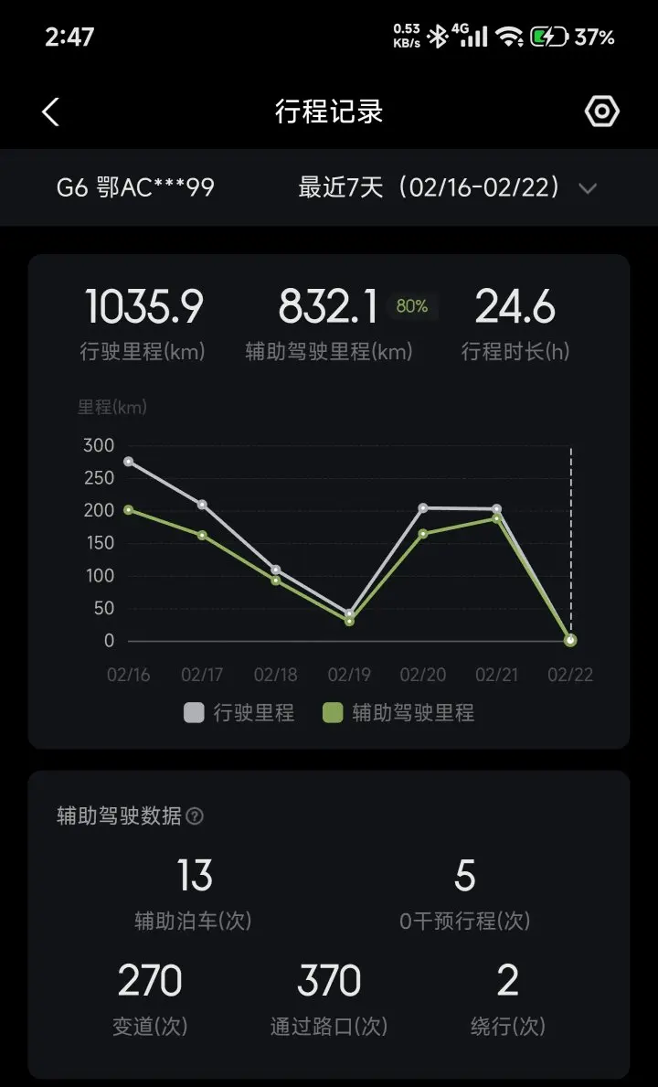 之前的老本田快十年了,每年过年返程堵车极度痛苦。年前一周买的25款G6科技,年前2天才上牌。过年7天湖北省内跑了一千多公里,智驾大概80%。
