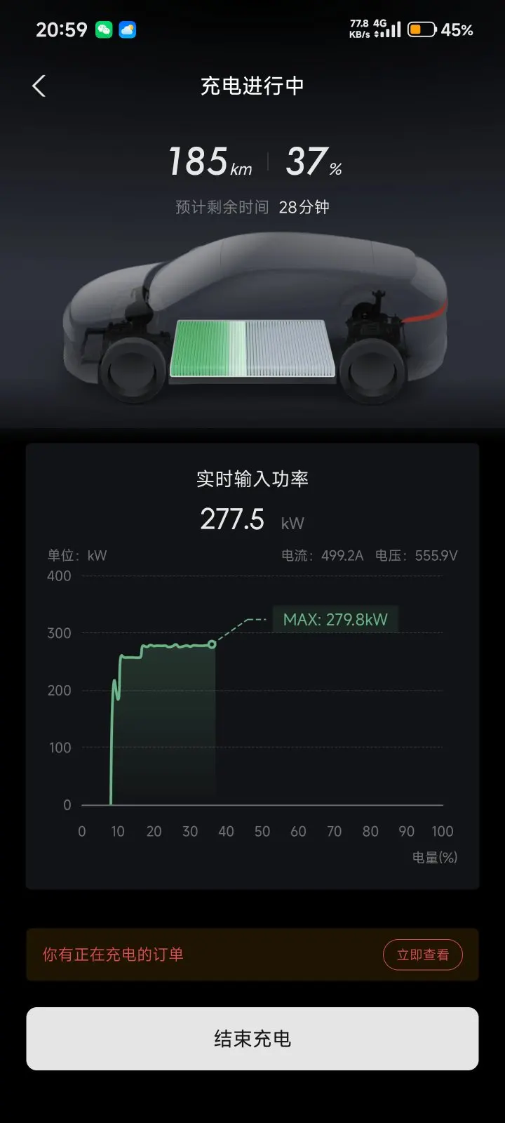 后面几天气温到10度以上之后,高速能耗15左右,满电能跑450-500,充电也很快,一般都在60kw以上,在自营充电站没车抢功率的话,能跑到280kw,非常爽。