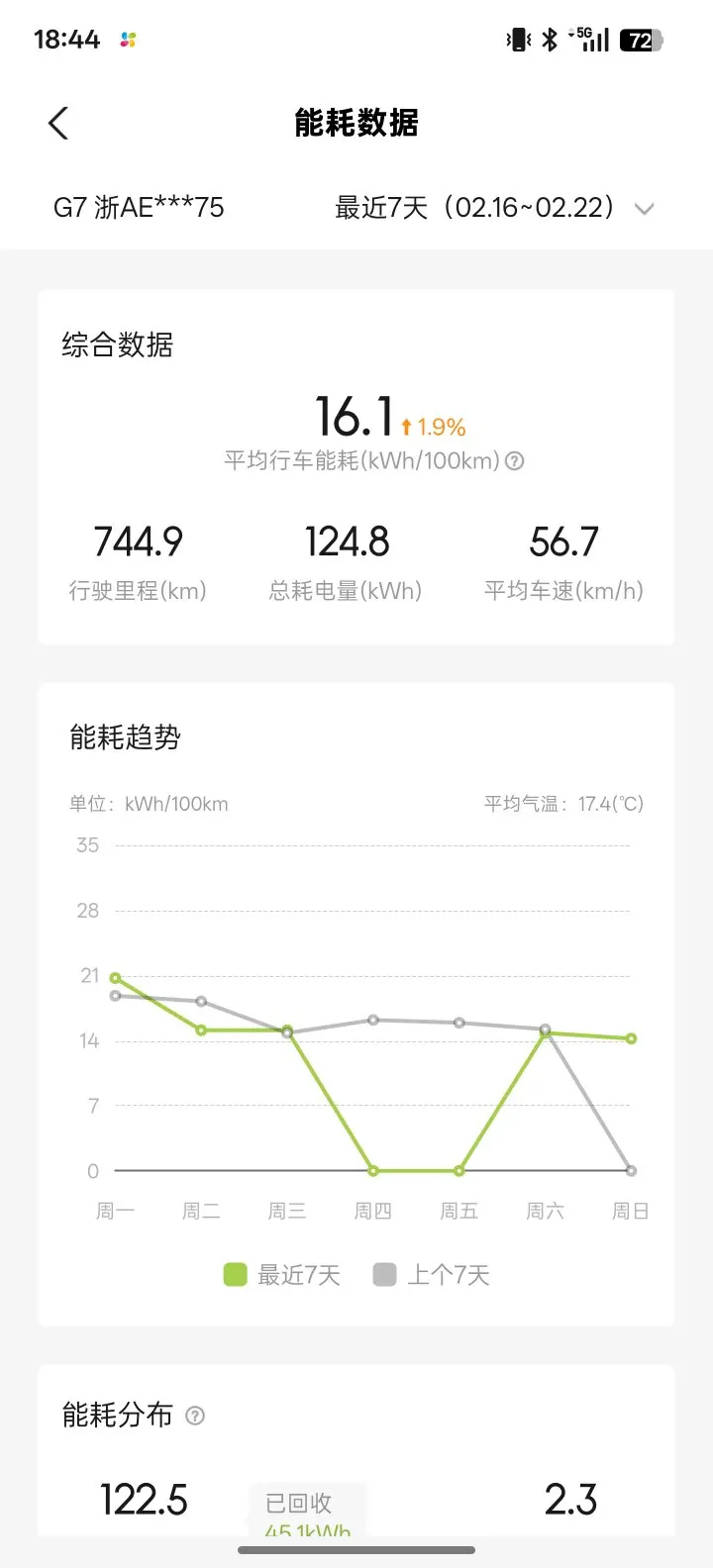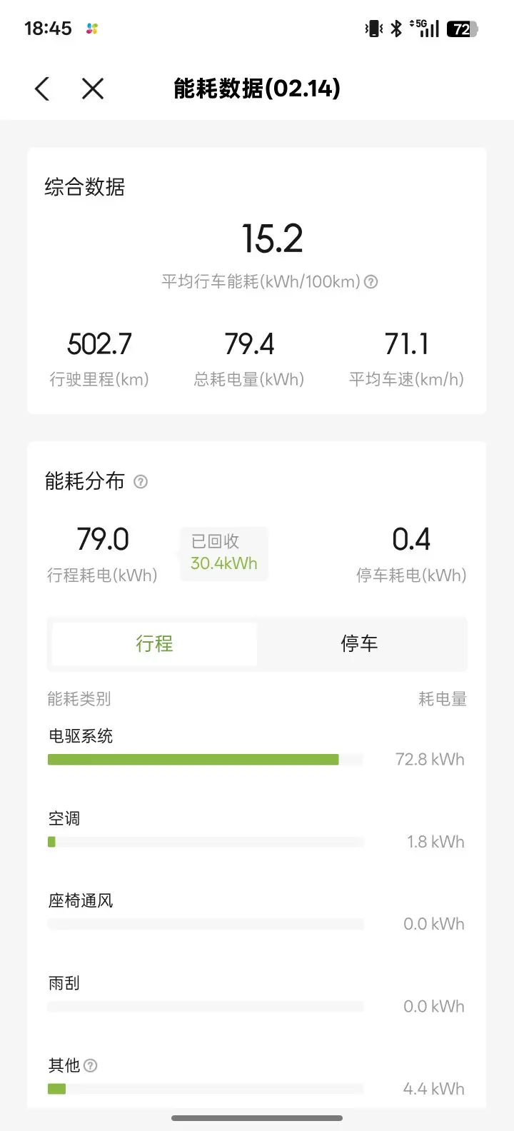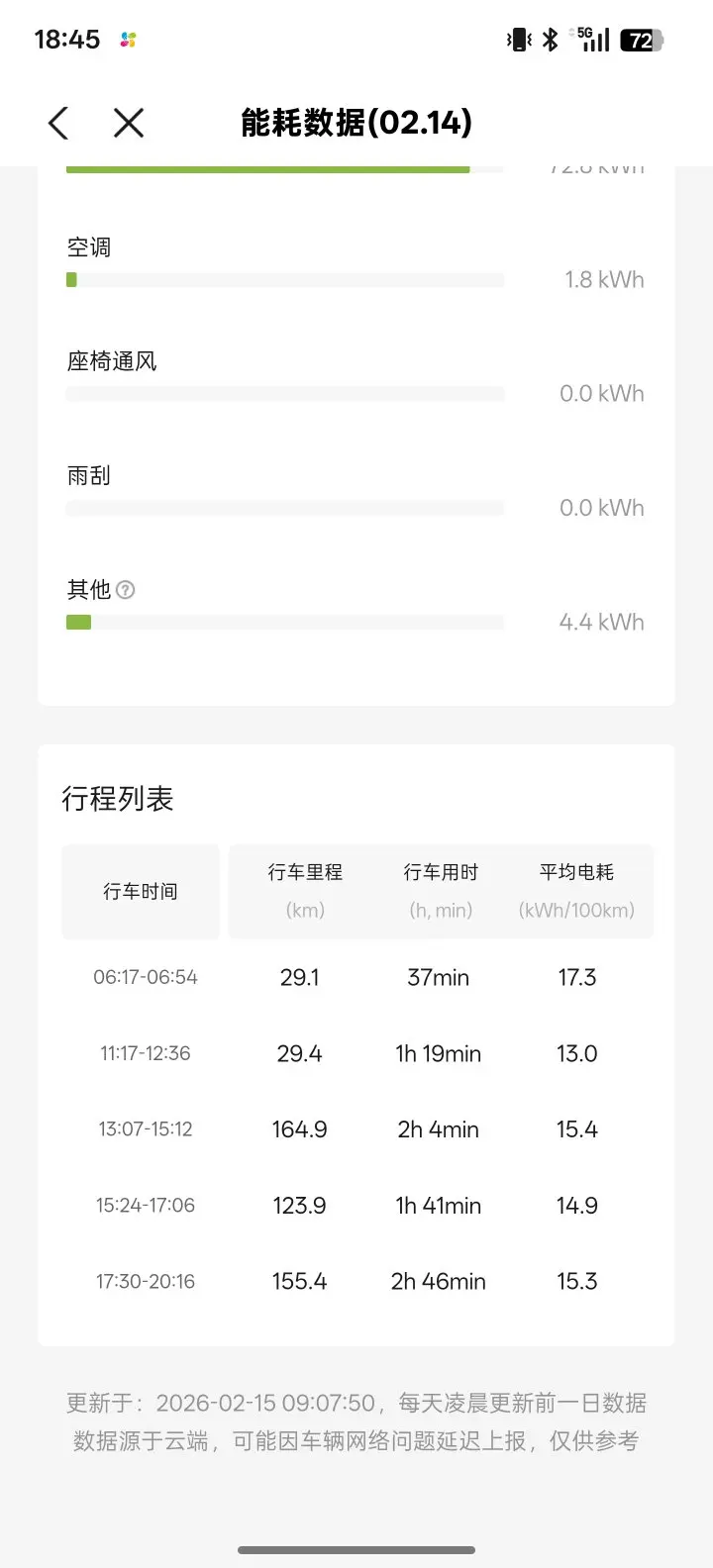 从能耗数据来看,2月14日的平均行车能耗仅为15.2kWh/100km,最近7天的平均能耗也控制在16.1kWh/100km,在冬季低温和高速工况下,这样的表现堪称优秀。扎实的续航和出色的能耗控制,让我彻底打消了里程焦虑。