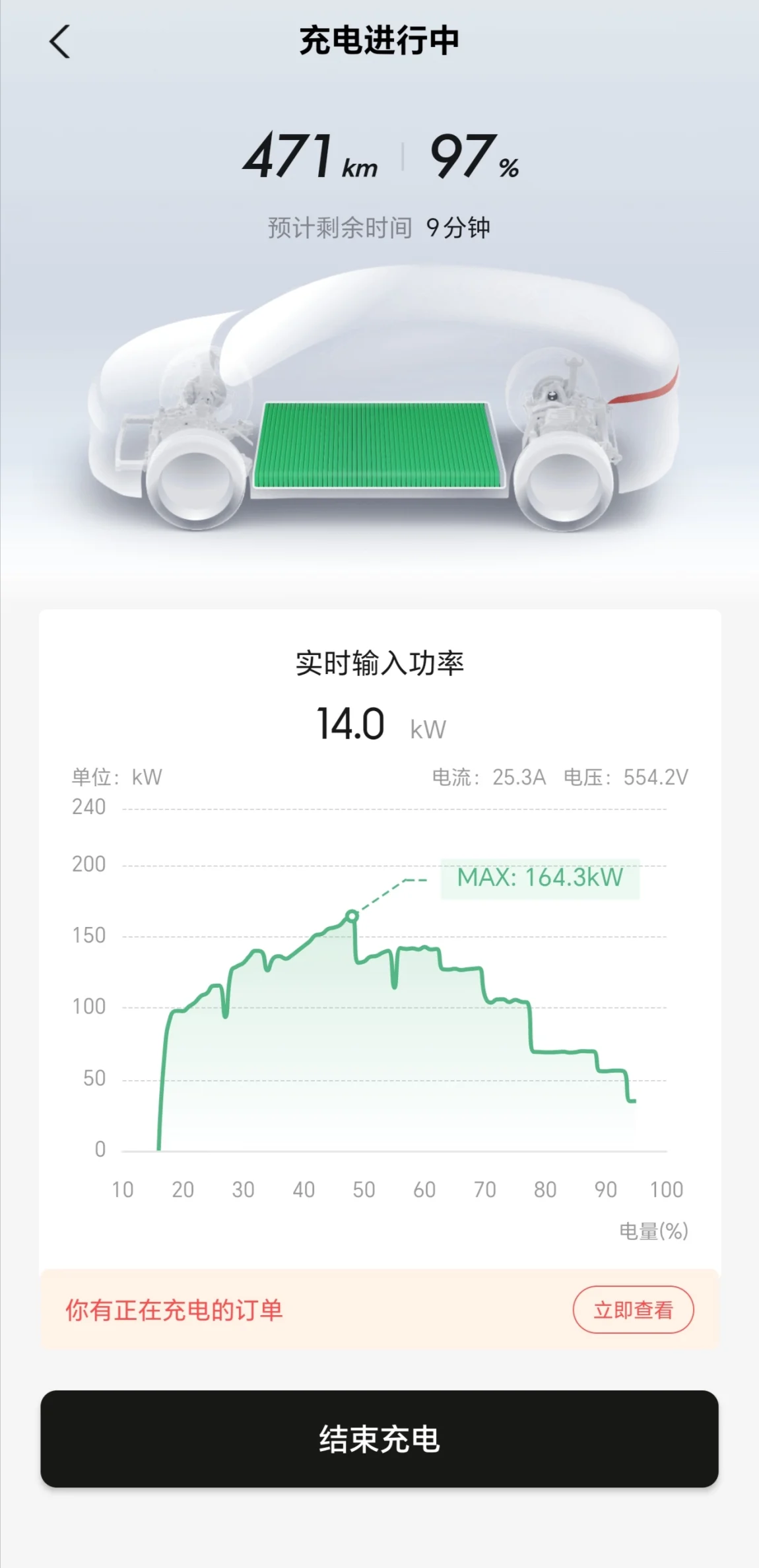 S4超充桩即插即充,充电功率瞬间飙升至161.76kW,平均功率稳定80.23kW,800V平台的补能优势尽显。从16%充至99%仅用时42分36秒,比普通快充节省23分钟,效率远超高速服务区充电桩。
