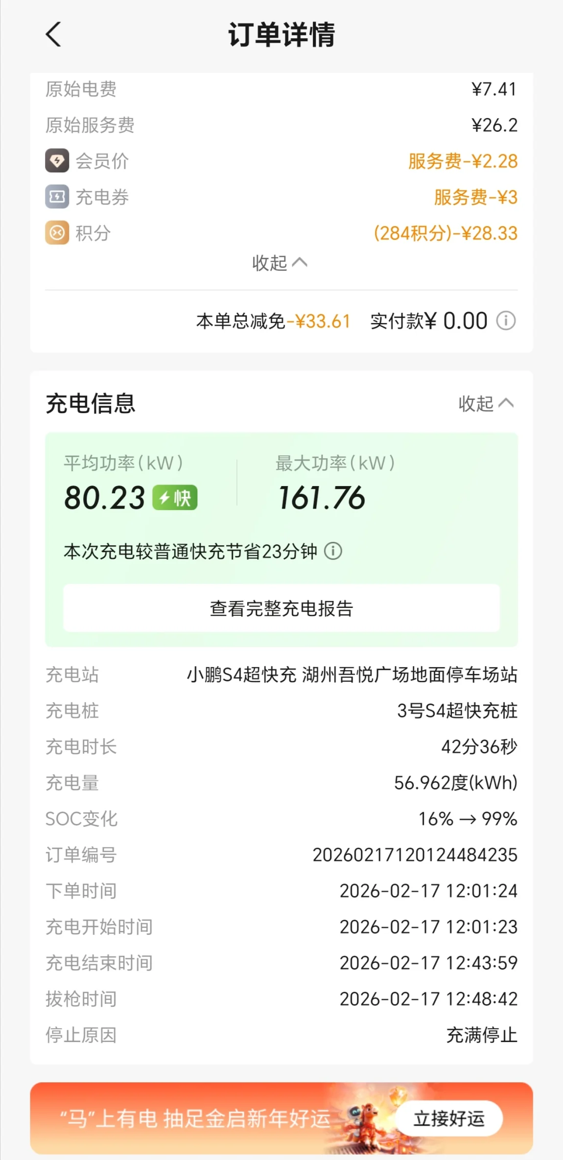得益于小鹏会员权益、充电券与积分抵扣,本次充电实付0元,性价比拉满。充完电表显续航485公里,满血出发,剩余路程毫无续航焦虑。