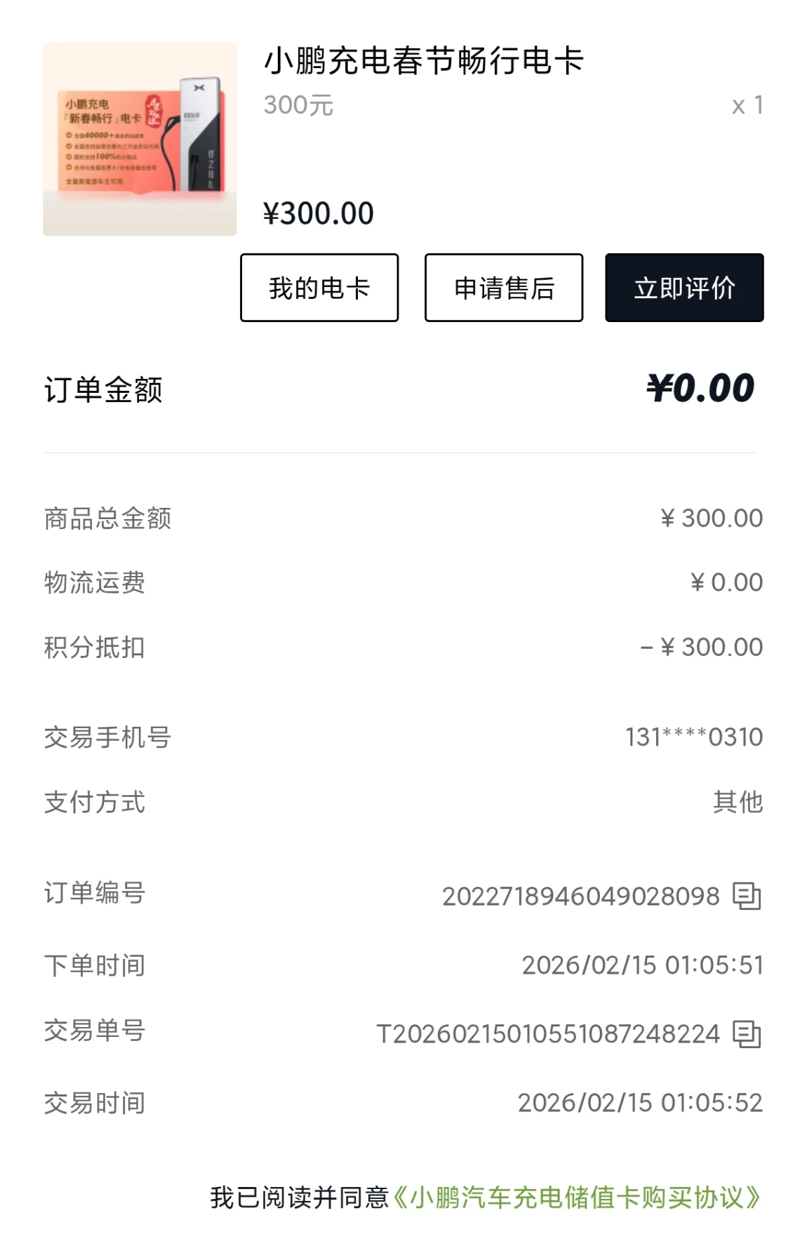 而且,我提前用积分换了小鹏的300元春节畅行电卡,一路上的充电费用基本都给覆盖了,心里那叫一个舒坦。