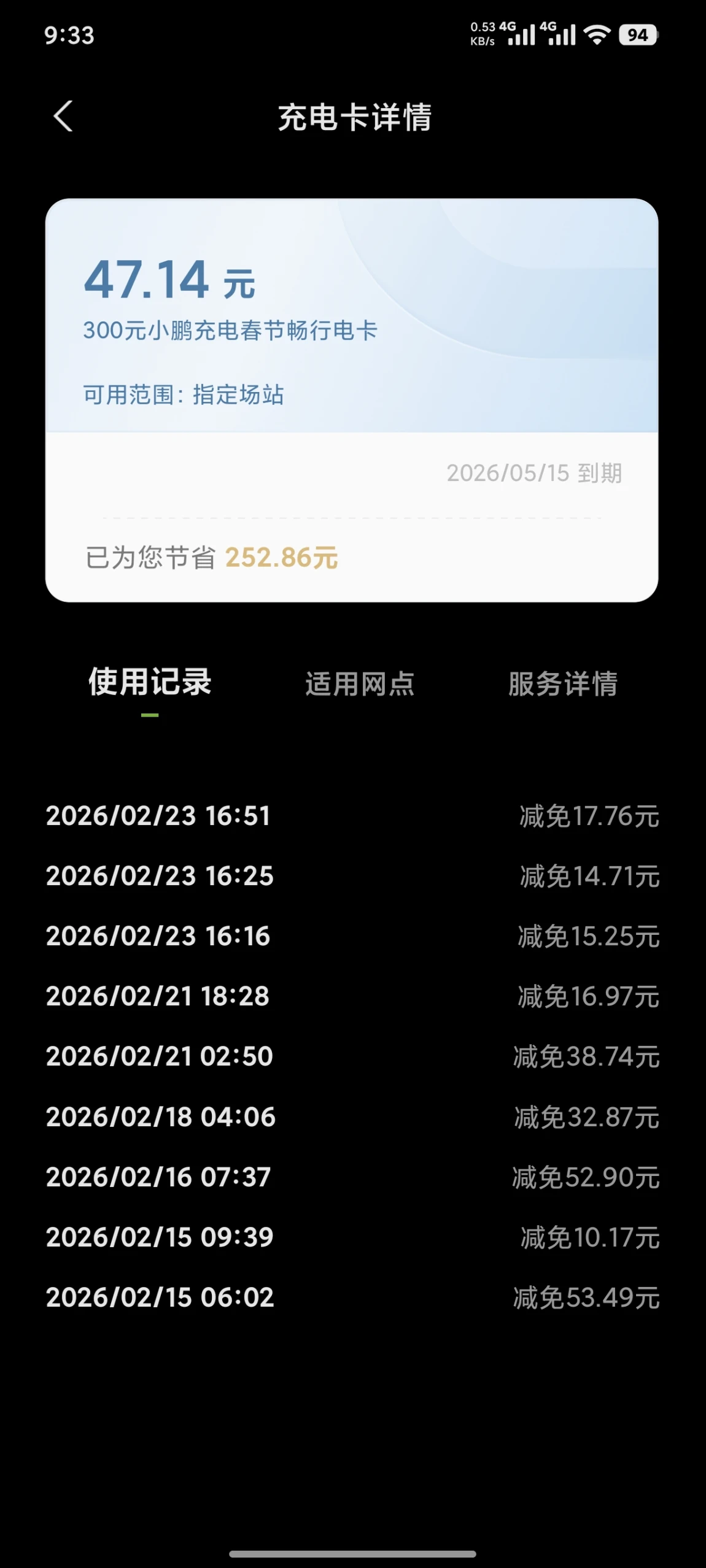 从2月15号到23号,这张300元的电卡帮我省了252.86元,最后还剩47.14元没用完,性价比拉满。
