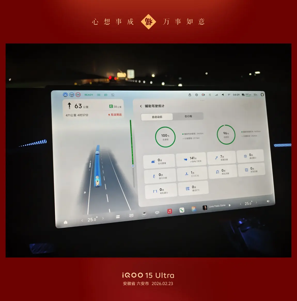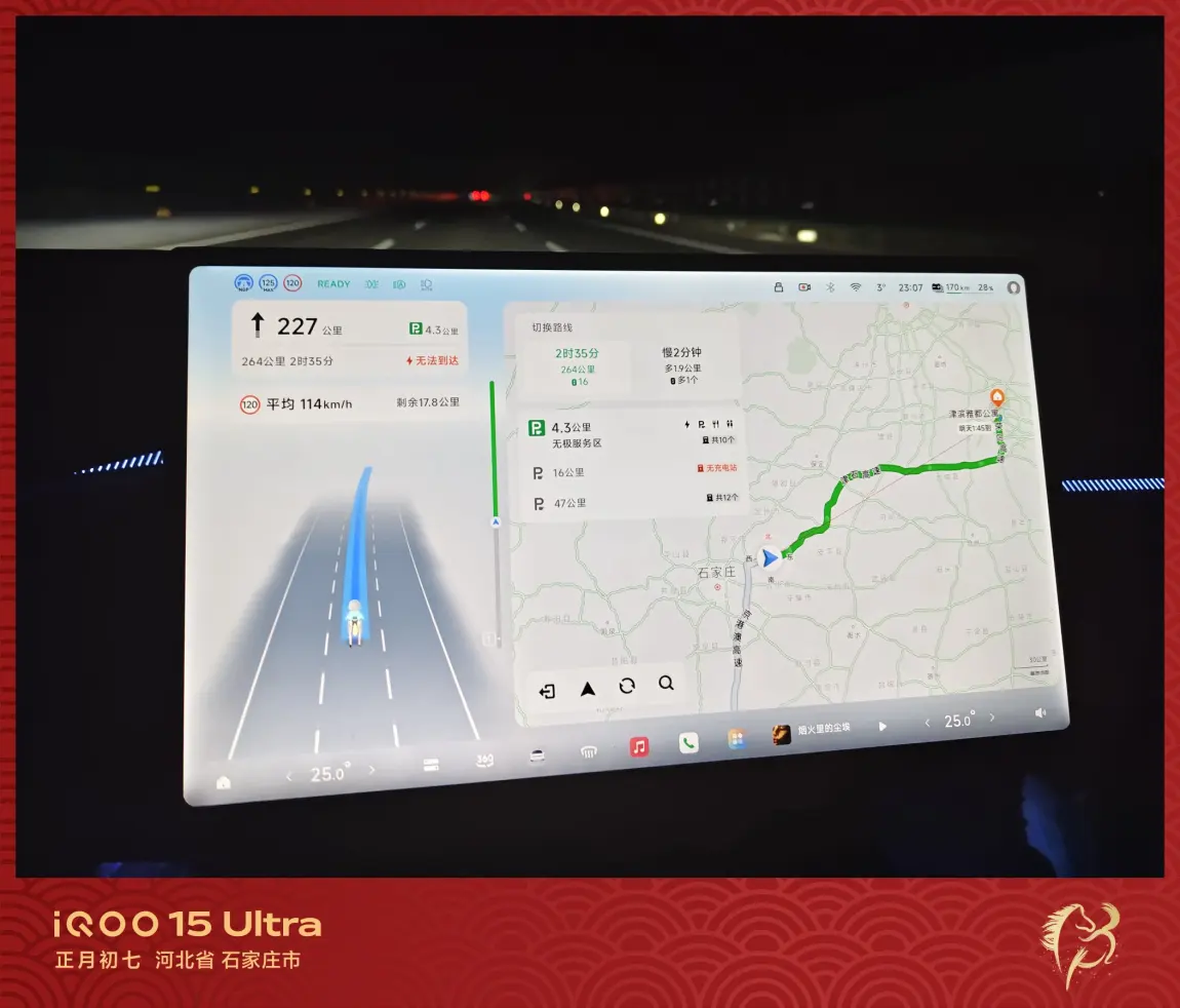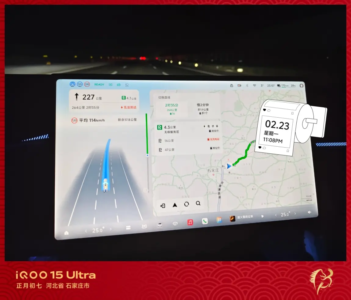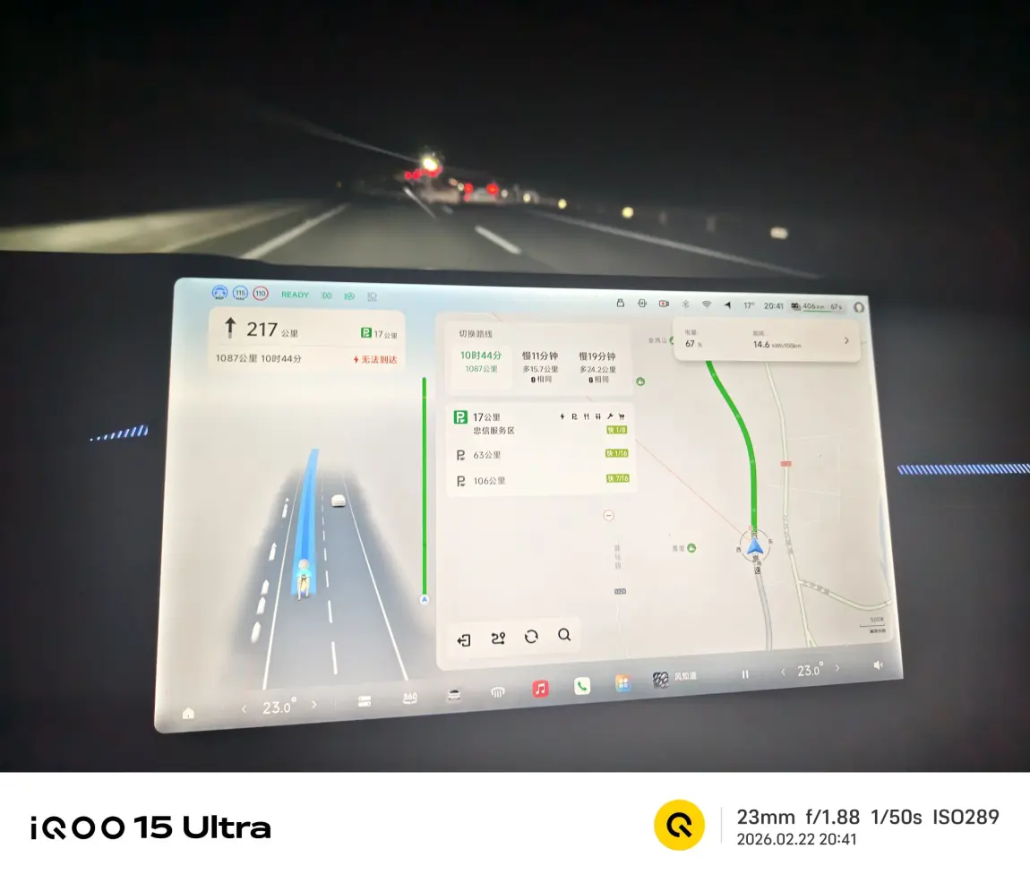 昨天晚上我先开了3小时,然后换我老婆开了3小时,然后她就睡觉了。我接着继续开了3小时,然后去服务区充电,顺便遛狗,休息,吃泡面,充满电后我还不困又开了2个小时,早上7点半我老婆醒了换她开,我睡觉。她开了2个多小时就到目的地了,如果是一个人开绝对没这么快到,因为精力扛不住,即便你有智驾辅助也做不到。所以说夫妻搭配,干活不累,出门最好有两个司机会轻松很多。