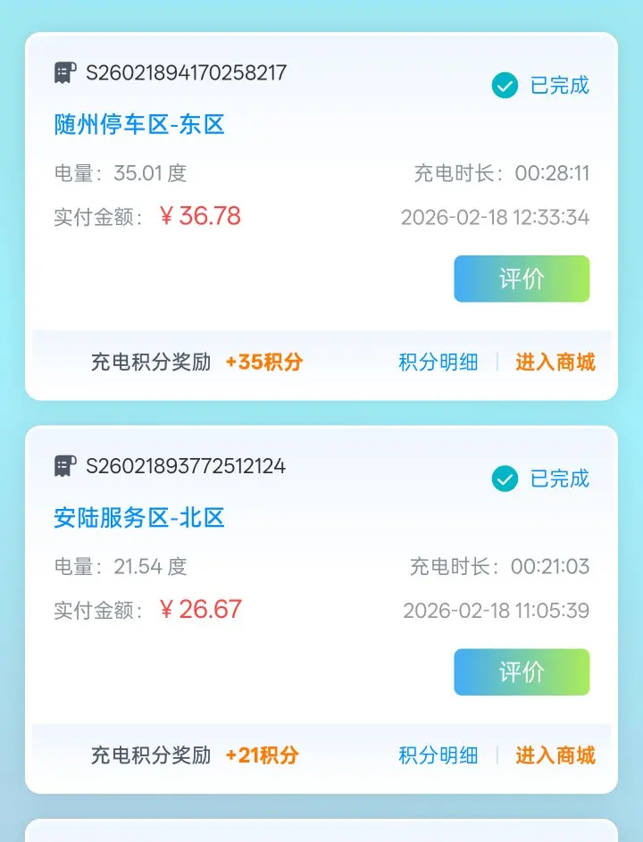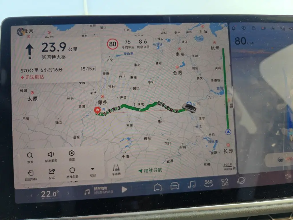 从武汉出发前往洛阳,恰逢正月初二回娘家的习俗,再加上武汉是交通枢纽、洛阳春节旅游热度居高不下,一路车流密集,这段580km的路程我们开了将近7个小时。途中我们分别在安陆服务区和随州停车区补能两次,湖北的高速电价很实惠,最高也才1.45元/度,完全能接受,中午时段更是低至1.05元/度,我们索性趁着离开湖北前把电充满,为后续行程做好准备。