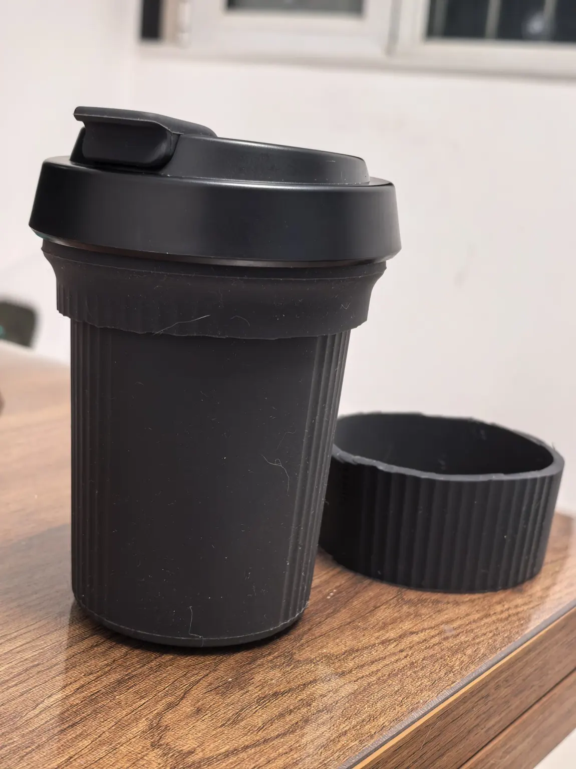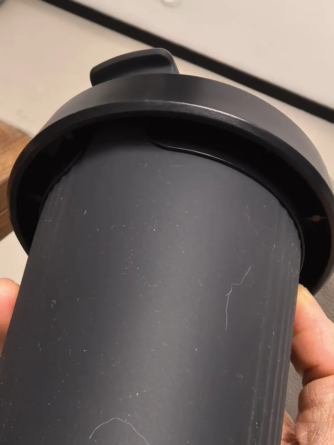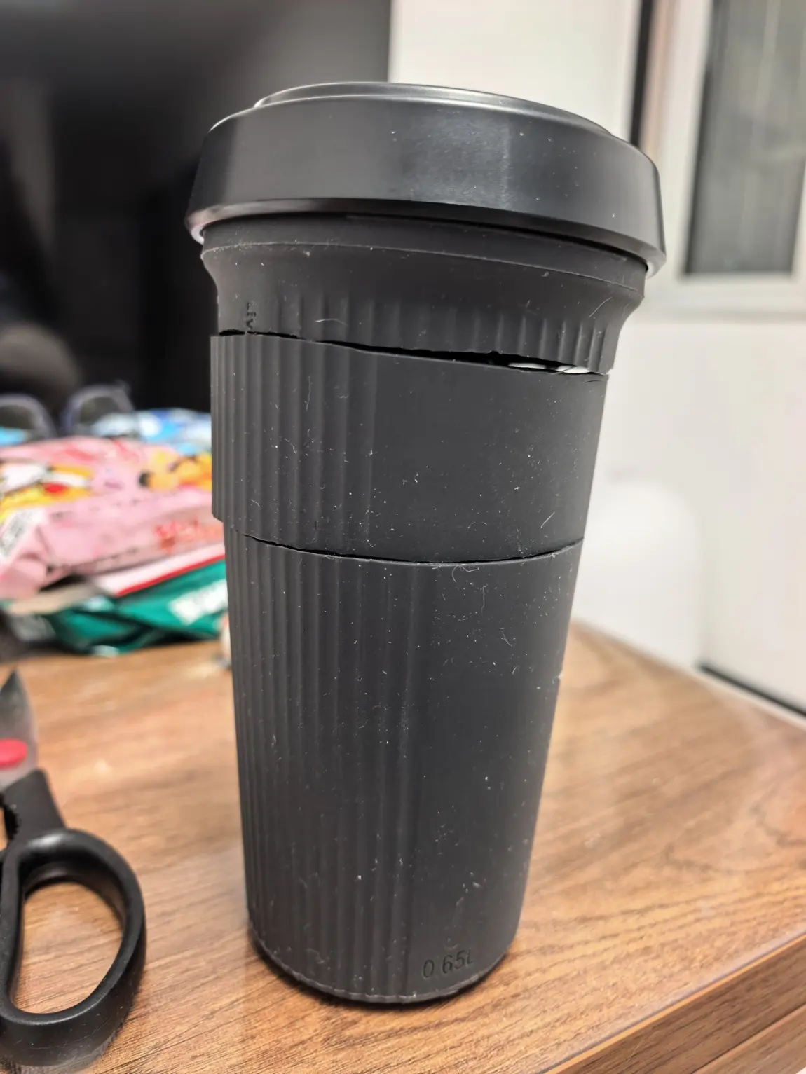 就在决定凑合刚才那个方案的时候,我发现盖子里面的大小,刚好能够塞进下面部分的上沿。并且卡的还比较紧,而且我这心灵手巧,第一剪下去,留下的高度刚好合适!直接握着盖子拿出来,也不会把桶身单独就在水杯架里。
