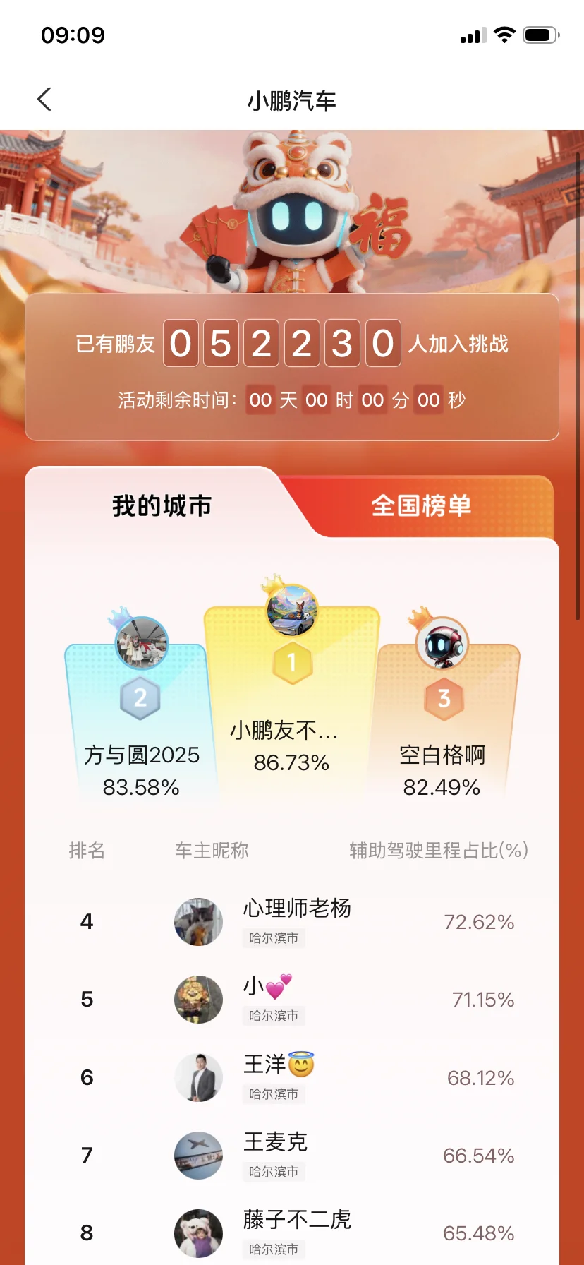 同时感谢小鹏所有工作人员,过年🧨坚持在一线的工作人员,心系所有鹏友,让我们这个新年更加充满动力,增加了趣味性元素,同时我也是哈尔滨市小鹏智能驾驶市第一名🏆,辛苦了㊗️各位事事顺心,开工大吉