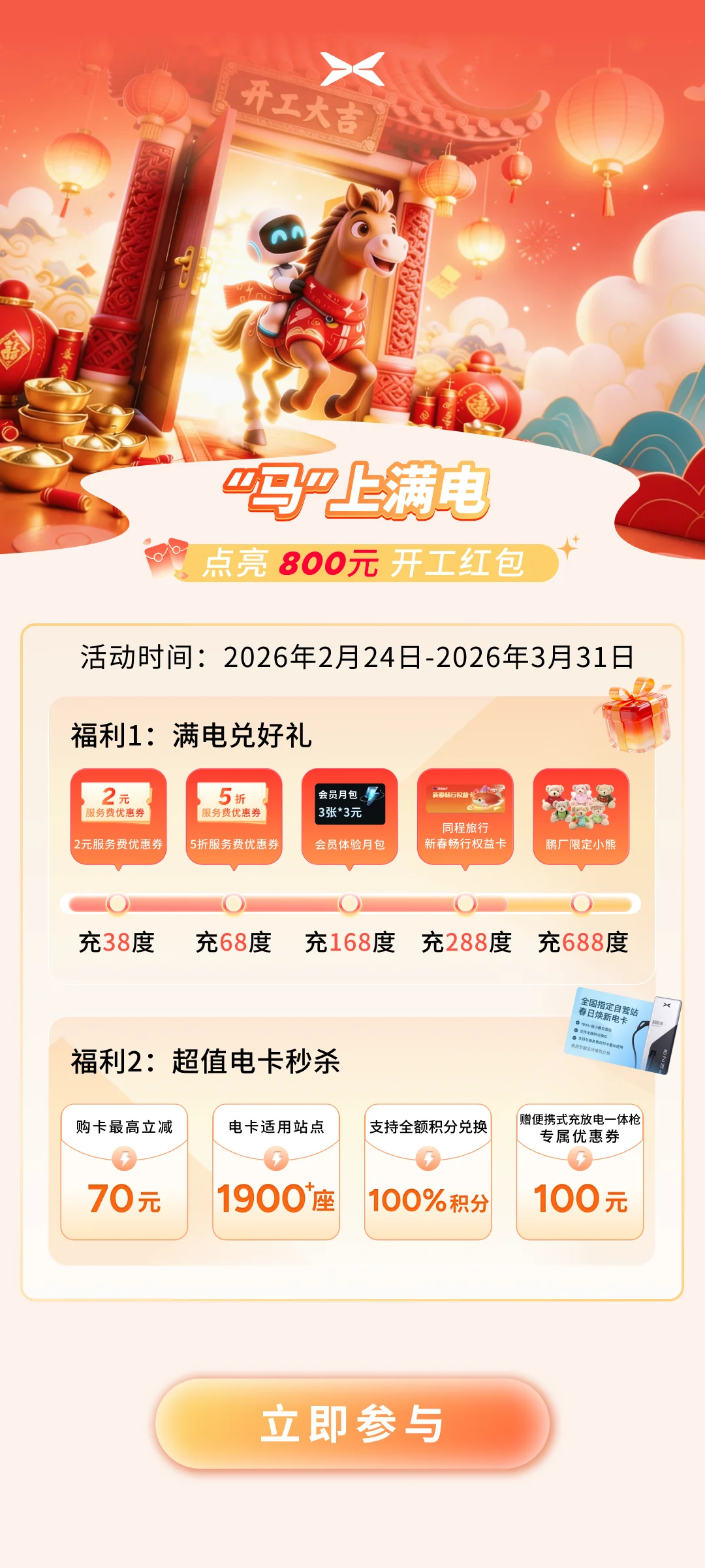 满电兑好礼,充满38度即可解锁惊喜,充越多礼越多。电卡限时回馈,48元起购,下单还赠百元家充优惠券哦~快来一键开启满电状态吧!参与对象:全量小鹏汽车APP用户活动时间:2026年2月24日00:00:00-2026年3月31日 23:59:59参与方式: