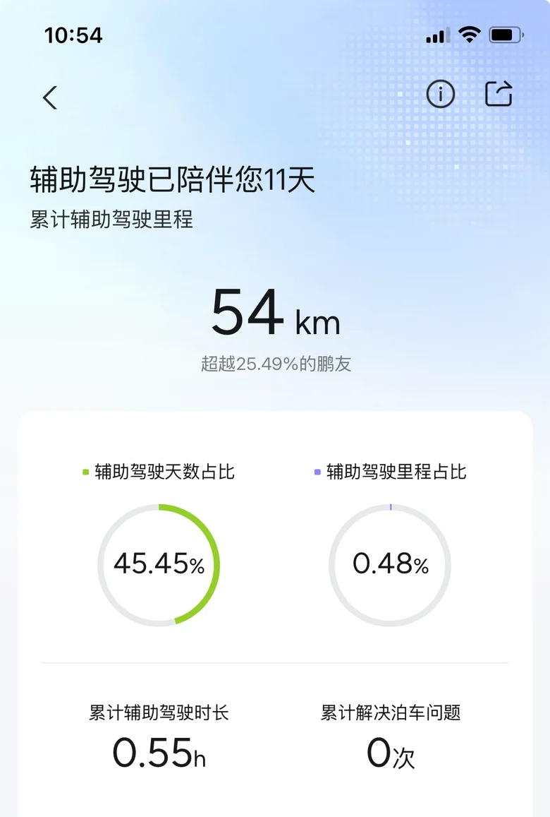 人就是这样,尝试了第一次,即便过程心惊肉跳,但顺利完成后就是“不过如此,原来这么轻松”🤭🤭🤭🤫🤫🤫。于是,第二第三次就自然而然的产生了,变道丝滑流畅;激活提速敏捷;应对前车突然刹车减速的及时预判;在直路、少车的状态下,被人工驾驶的兄弟鄙视、闪灯🤣🤣🤣,它都丝毫不受影响,依然按照它的既定路线和驾驶方式,稳定前行!同行的大小队友都对黑珍珠的智驾体验,赞不绝口,我也从最初的胆战心惊,变成后面的从容自如,智驾体验的里程从2.7km涨至54km。