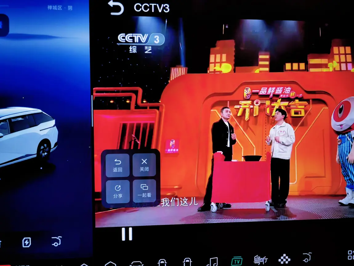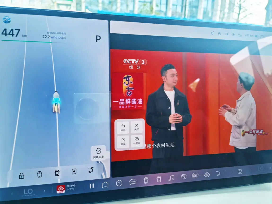 X9不像G9的副驾驶还有一个副屏,坐在副驾驶上如果想和后面的老小同屏观看同一个节目,按照X9用车说明方法只有两种——方法一:主驾/后排娱乐屏可通过三指或四指滑动分享应用;方法二:在在第三方应用界面的悬浮条点击【一起看】按钮,中控屏和娱乐屏可同时观看。 但在实际开车操作过程中: