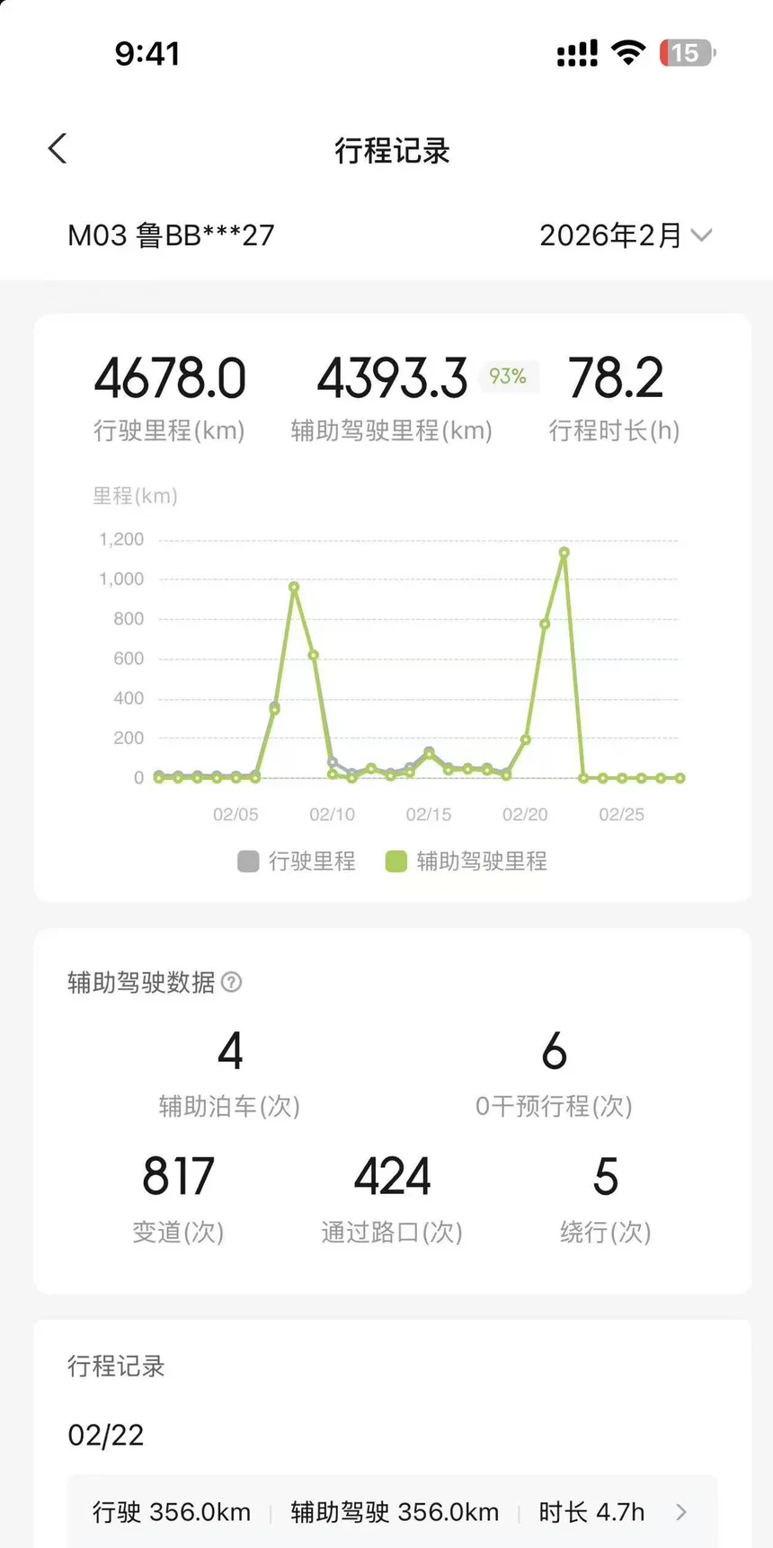 • 辅助驾驶里程:4393.3 km,占比高达 93%