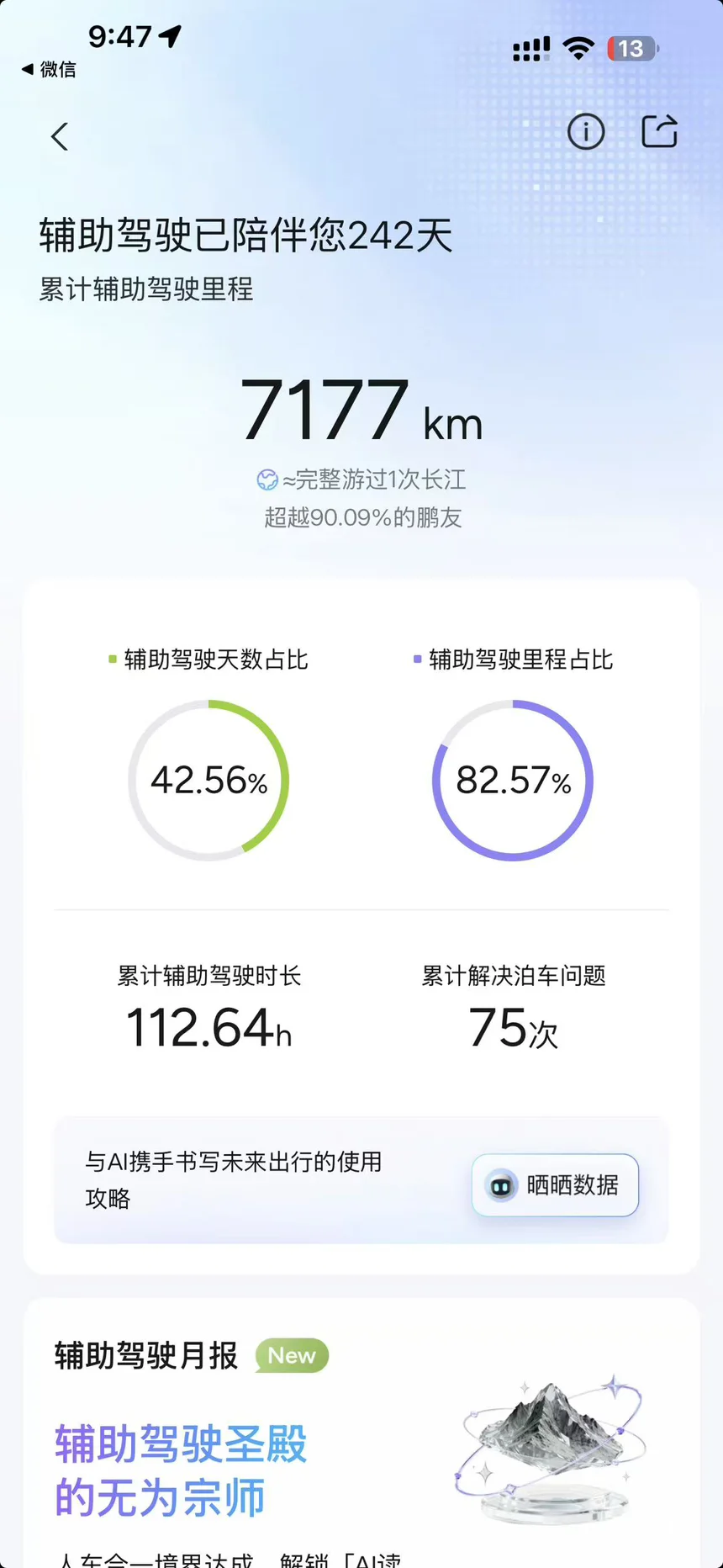 • 累计辅助驾驶里程:7177 km,超越了90.09%的鹏友