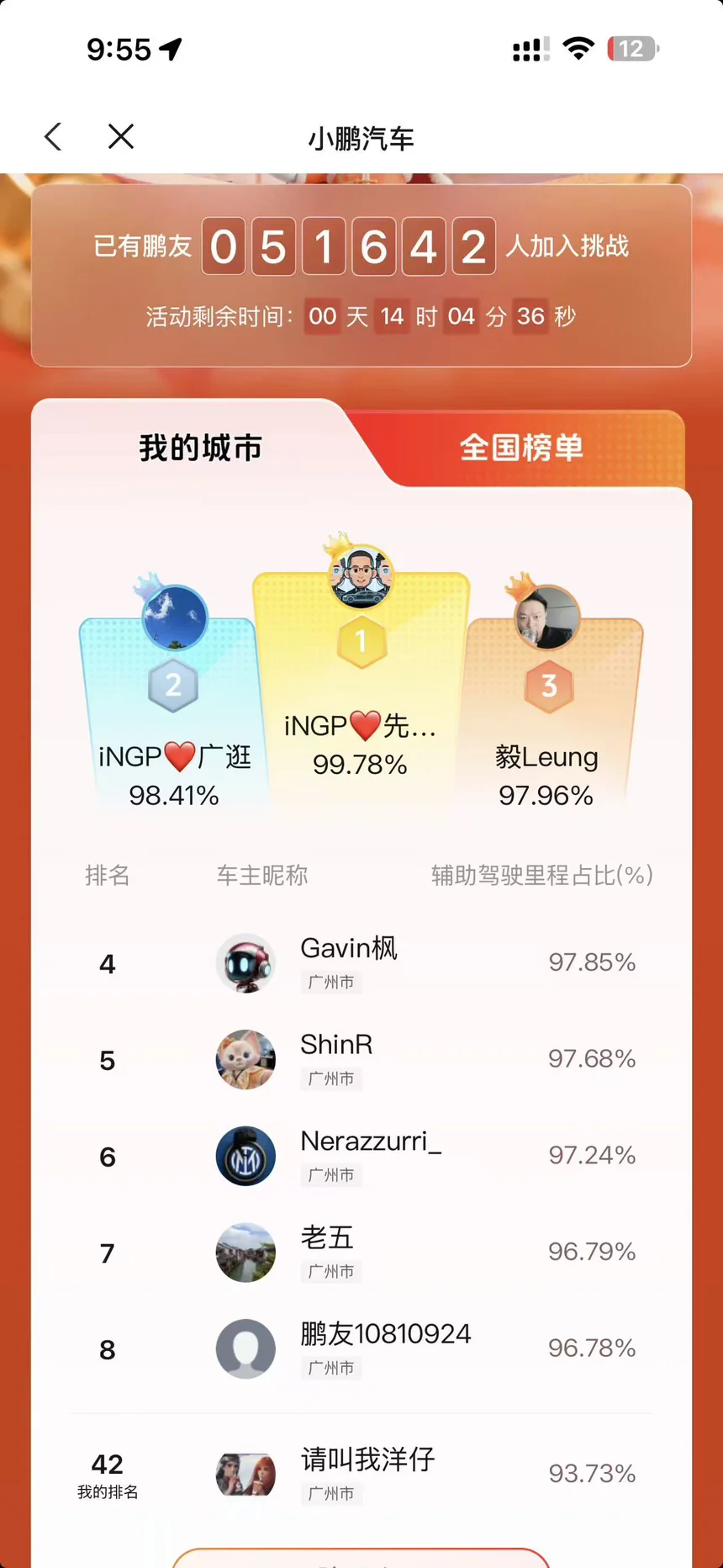 在广州的辅助驾驶里程占比挑战中,我也以93.73%的成绩位列城市第42名,这不仅是数据,更是对小鹏智驾系统的信任与依赖。
