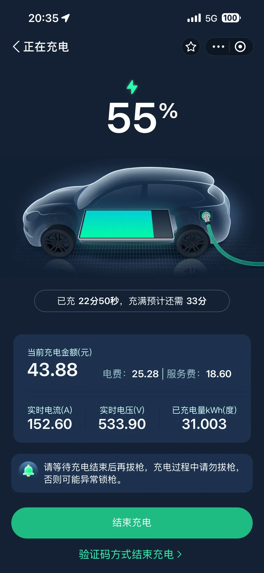 深夜20:35,电量55%,接入充电桩。实测电流高达152.60A,电压533.90V,充电功率相当可观。已充31.003度电,花费43.88元。虽然服务费占了近一半(18.60元),但为了赶路,这钱花得值。看着电量飞速上涨,心里的石头也落了地。