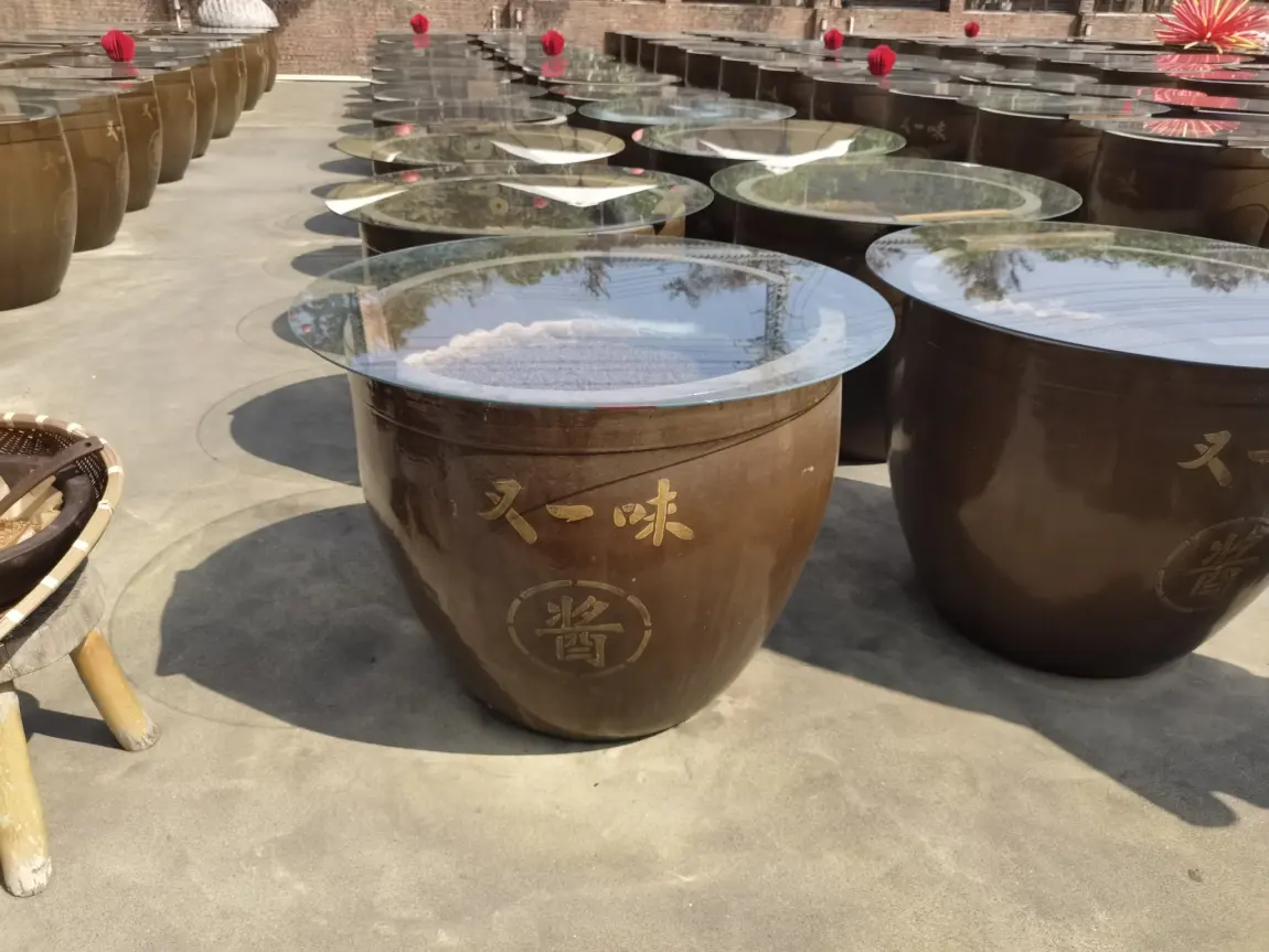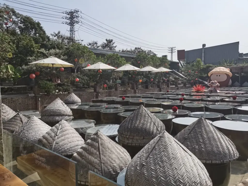 走进酱园,眼前的景象让人震撼:上百个一人多高的酱缸整齐排列,在阳光下泛着温润的光泽。缸口覆盖着竹编的斗笠,仿佛在守护着里面正在发酵的时光。这些酱缸,就是又一味酱园的灵魂,它们在这里“日晒夜露”,日复一日,年复一年,将黄豆的精华转化为醇厚的酱油。