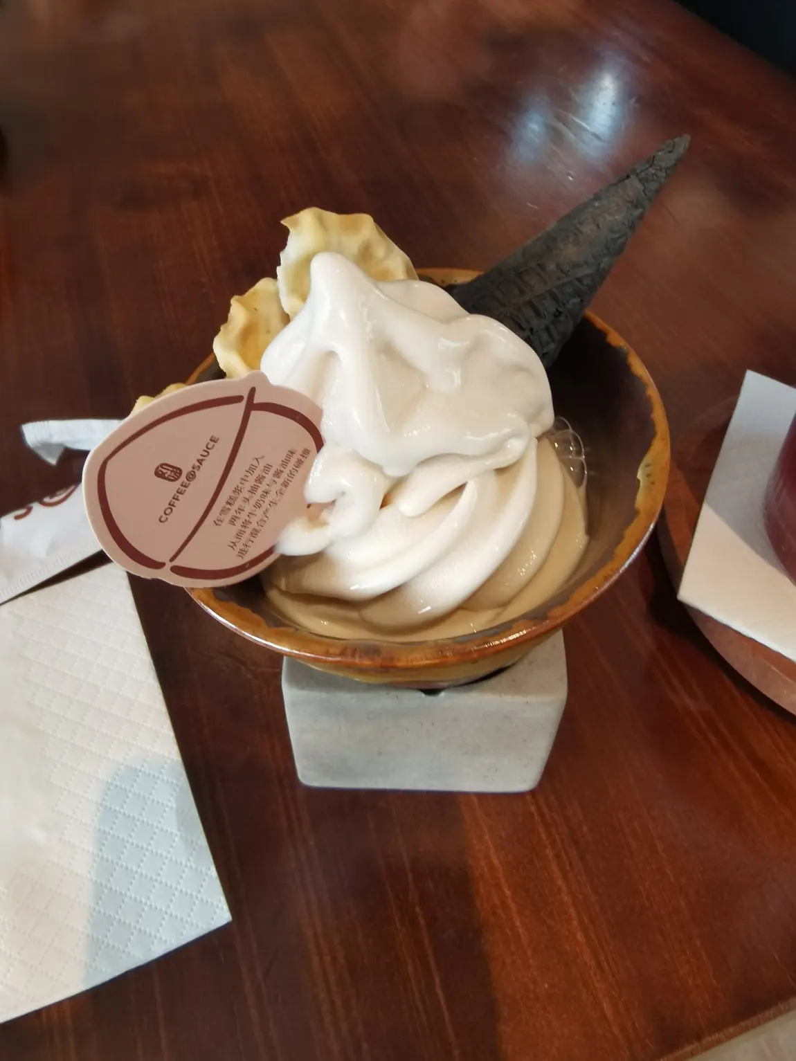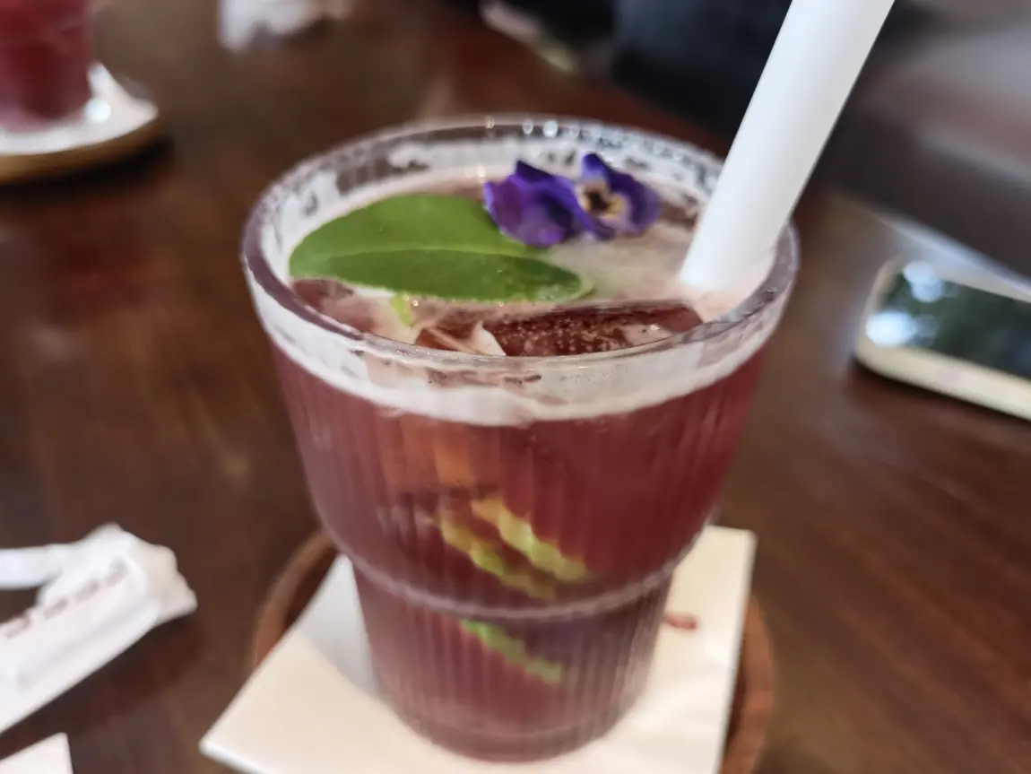 我点了一份招牌酱油冰淇淋,黑色的脆筒配上奶白色的冰淇淋,上面还点缀着一片薄脆。入口的瞬间,先是冰淇淋的绵密香甜,紧接着是一丝若有若无的咸鲜,这种奇妙的口感碰撞,让人眼前一亮。家人则点了一杯紫红色的特调饮品,杯口装饰着一朵紫色的小花,颜值与风味并存。