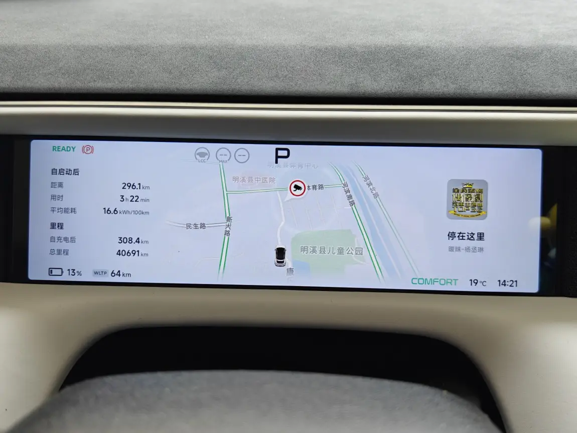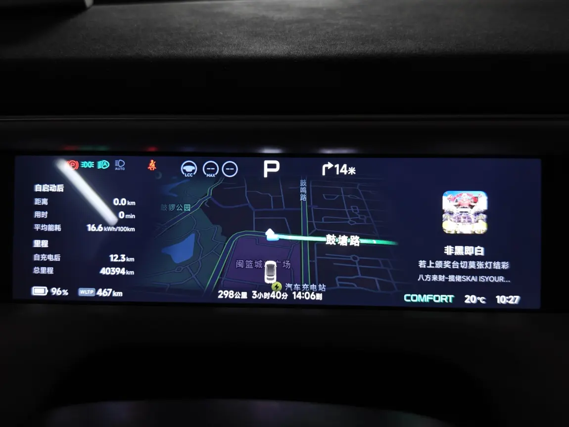 ok,最后咱们来看看本次自驾回乡的一个能耗表现,本次路上温度20度左右,路上跑120km/h的一个时速,出发前467km,跑了296km,剩余64km!续航达成率73的的一个水平,还是非常的不错的呀