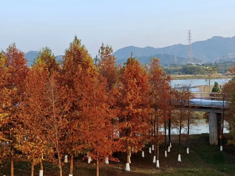 17:00 去白鹭岛公园溜达,傍晚的落羽杉红得正好,沿着江边步道走走,晚风一吹超惬意