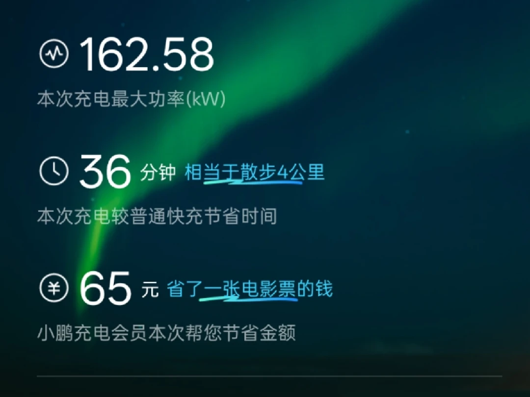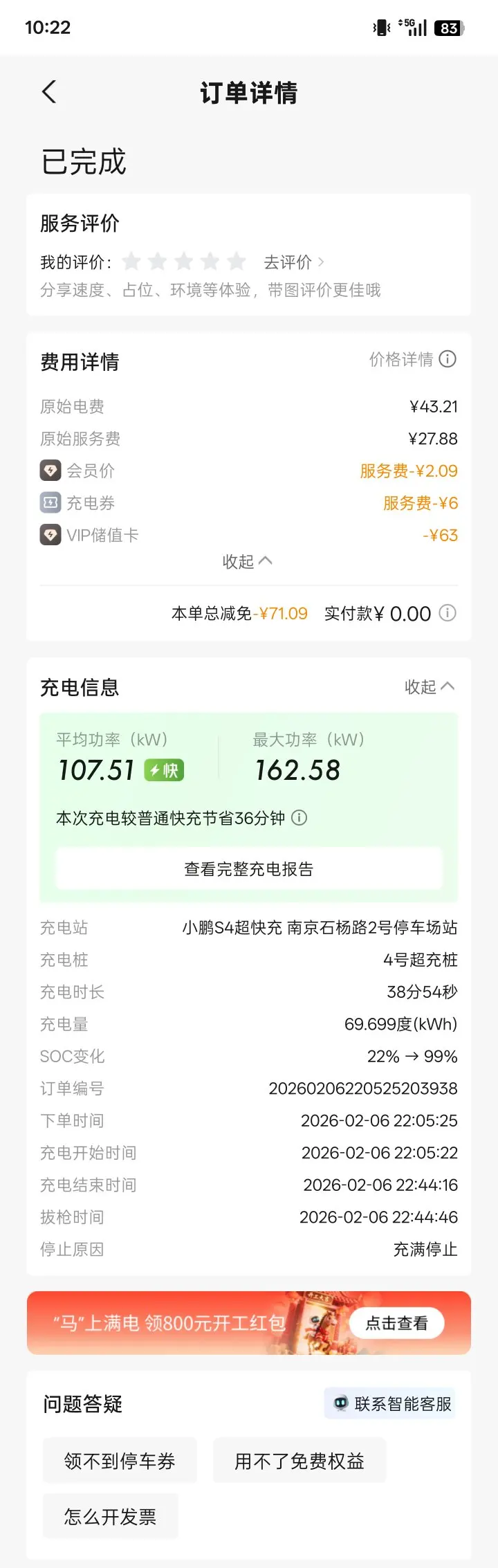 而且超充的效率是真的顶,之前在南京的小鹏S4超充站补能,最大功率直接冲到了162.58kW,平均功率也有107.51kW,不到40分钟就从22%充到了99%,比普通快充省了半个多小时,一杯咖啡的功夫就能满电出发。不光充电快,充电环境也干净舒适,价格还特别划算,会员有专属优惠,积分能直接抵扣电费,电卡性价比也很高,日常用车成本直接拉到最低。