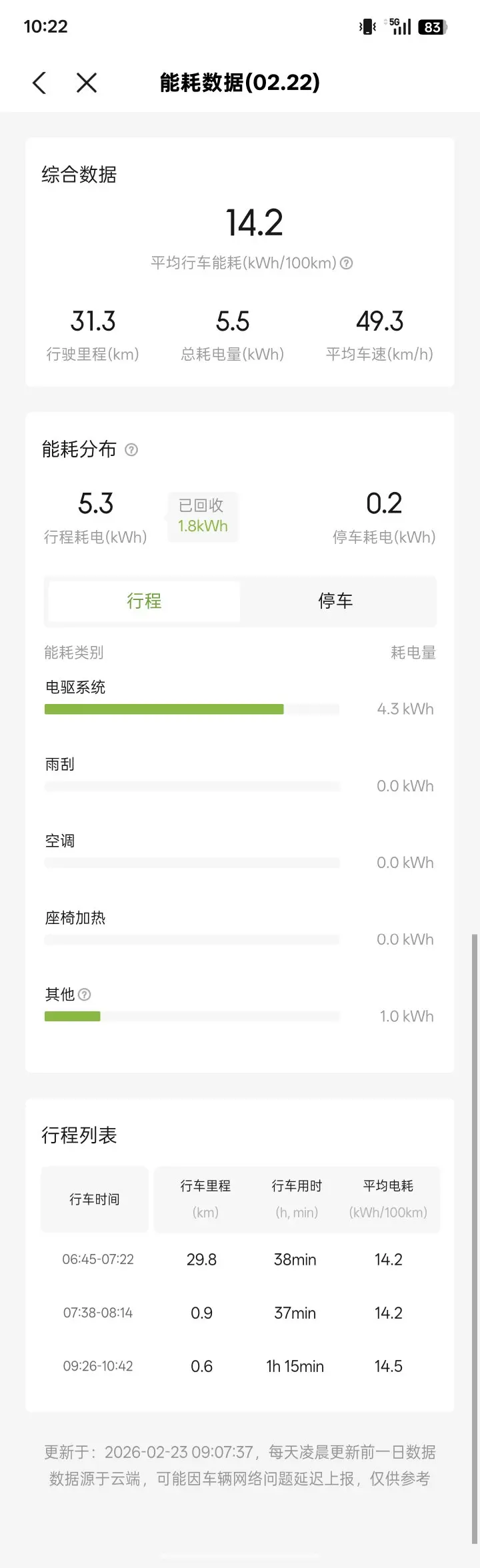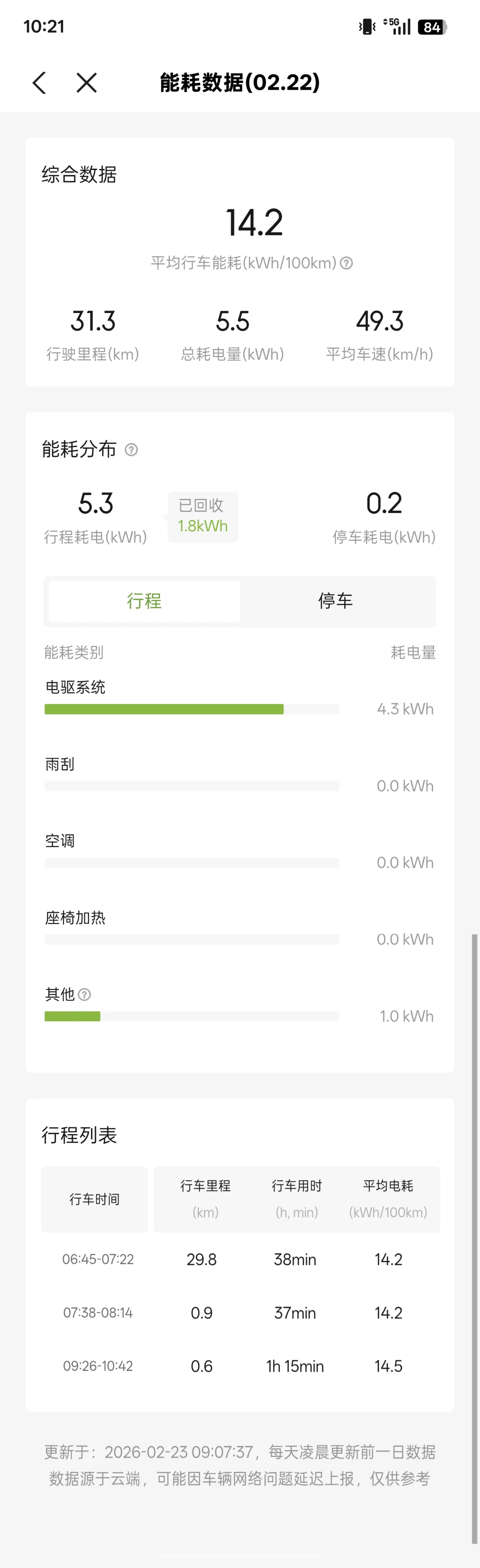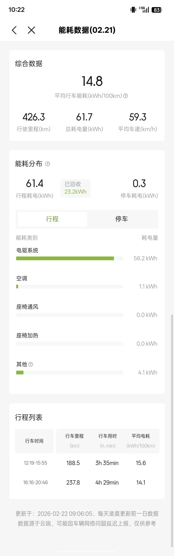 2月21日我从温州苍南开车回杭州,本来提前做好了长途堵车要中途补能的准备,结果中午12点多出发,一路堵车硬生生开了八九个小时,晚上9点多才抵达杭州。本以为续航会掉得很厉害,结果到杭州之后,第二天我还正常开着它去公司上班,最后剩余里程居然还有100多公里!
