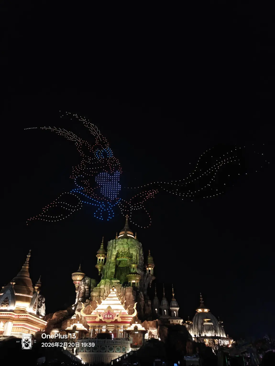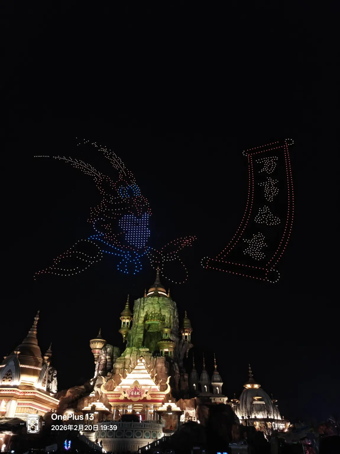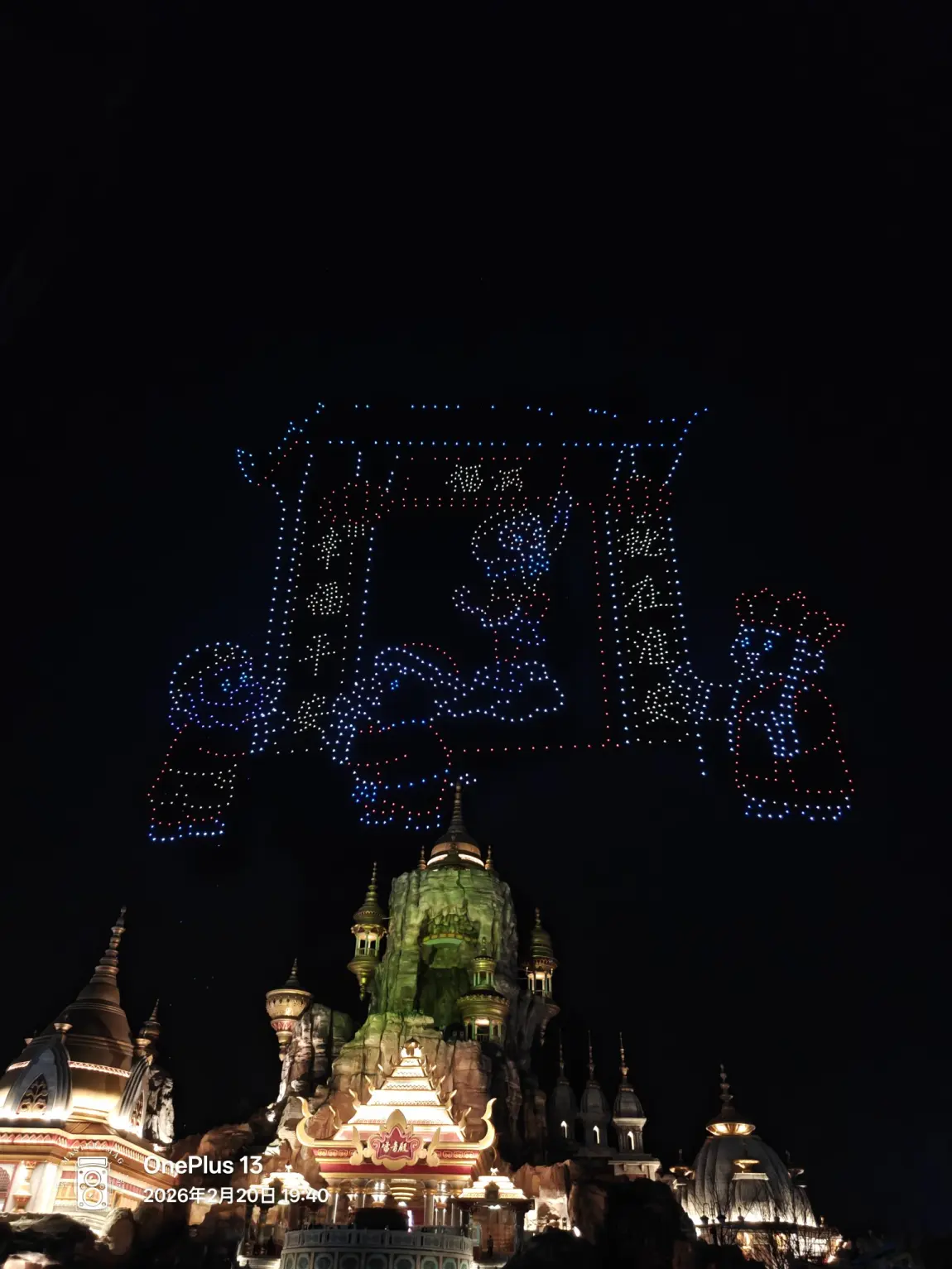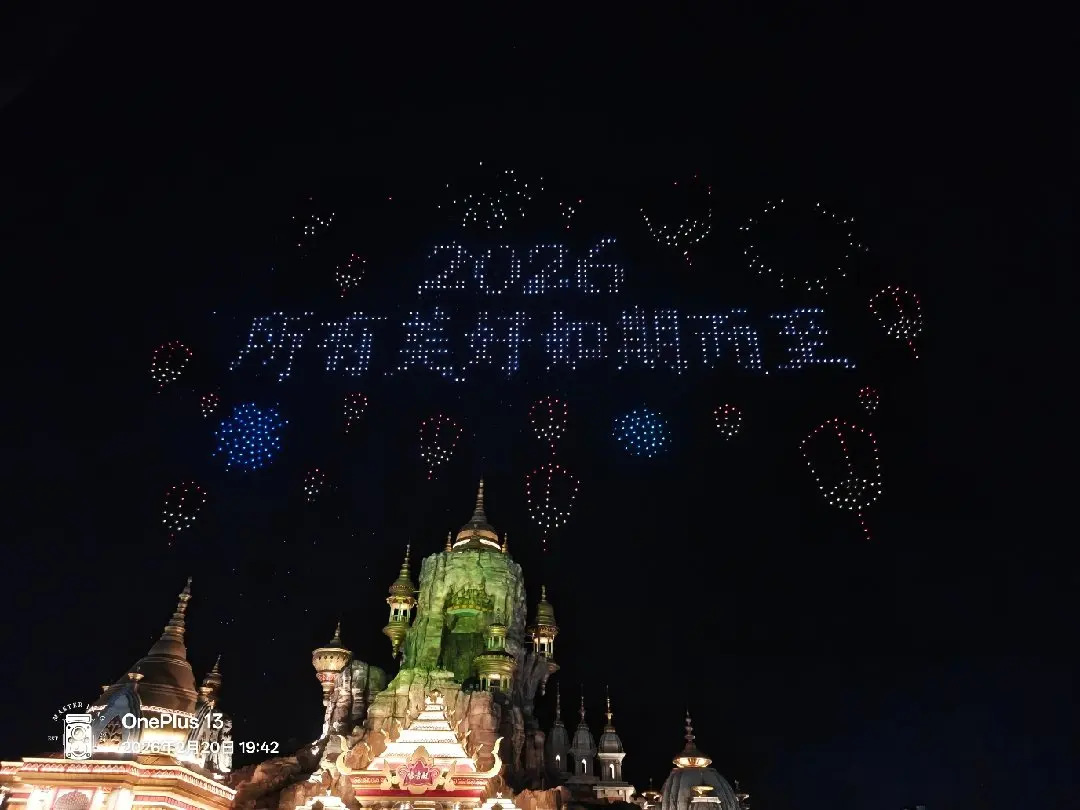 元宵佳节,华灯初上,夜幕成了梦幻的画布。无人机群似灵动的星子,在夜空勾勒出“2026 所有美好如期而至”的祈愿,还有那如烟花、似灯笼的光影,与下方充满异域风情的建筑交相辉映。
