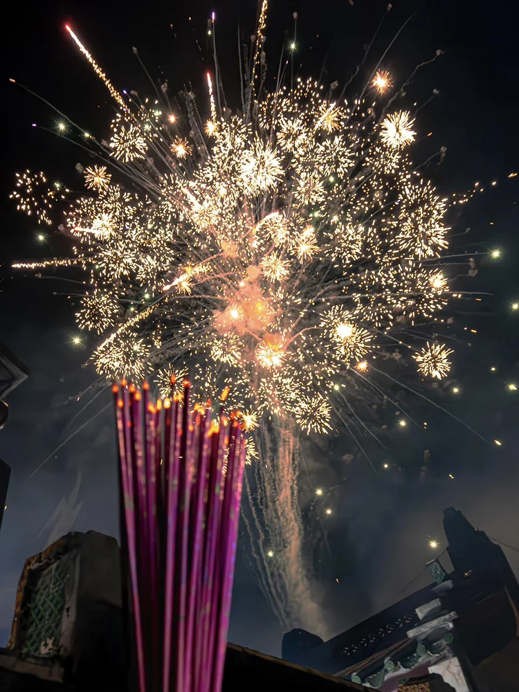 暮色四合,万家灯火次第点亮。成片的红灯笼在街巷间交织成海,暖黄的光晕透过竹编灯身,在地面投下细碎的影。远处的内海湾畔,烟花骤然升空,金芒炸裂的瞬间,与手中的香火交相辉映——烟火向星辰,祈愿寄山海,这是汕头人刻在骨子里的仪式感。