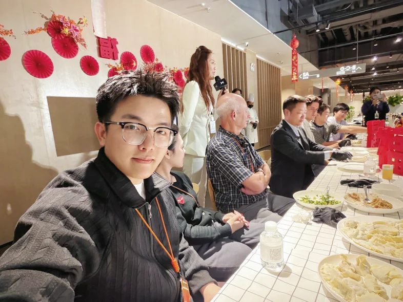 🥟今天的行程来到了尾声,全部鹏友一起来到了饭堂包饺子,大家围在桌边,包出来的饺子五花八门,笑声就没停过,坐在我对面的印尼鹏友Sam,举着他包的饺子开心的说着“Look at my work, This is the fish, this is the candy and the golden treasure.”。