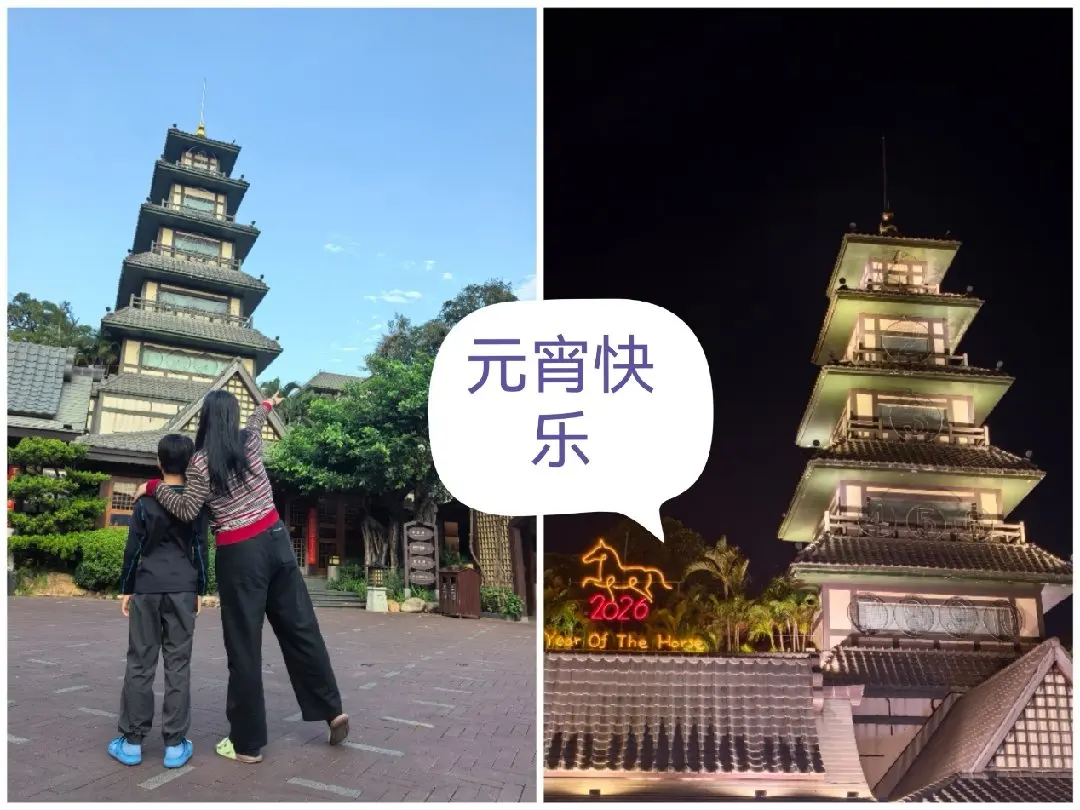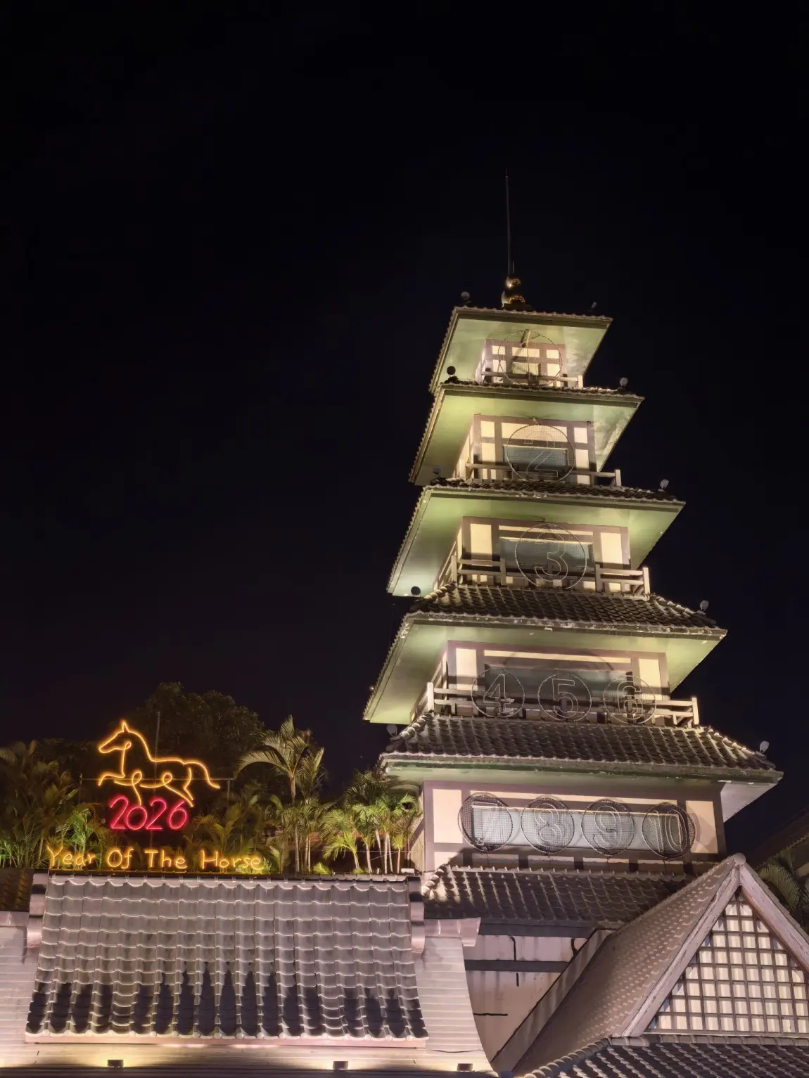 - 入口处的五层塔,在夜晚的灯光下格外梦幻,“2026 Year Of The Horse”的霓虹牌,为马年的元宵增添了几分热闹。