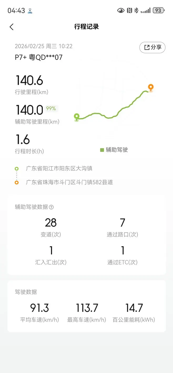 最终,这趟行程的辅助驾驶里程达到了140公里,占比高达99%。这不仅是数据,更是对小鹏智驾系统最直接的信任。