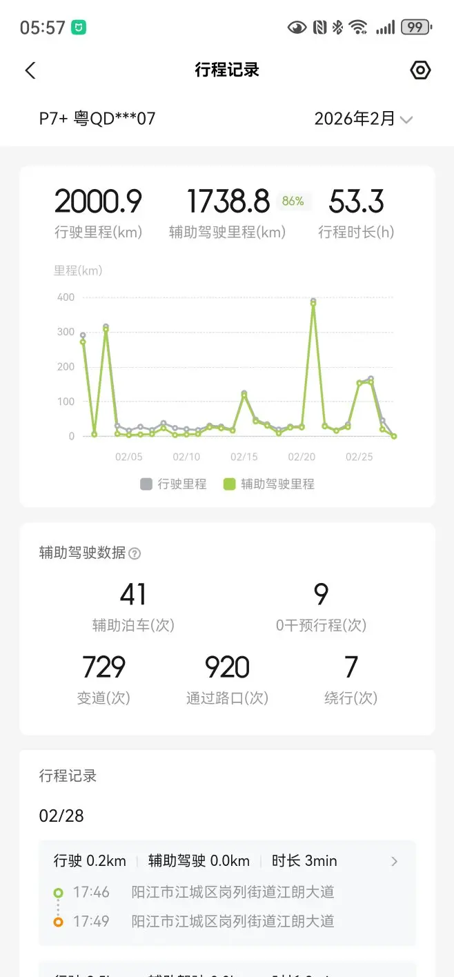 整个2月,我的P7+总行驶里程2000.9公里,其中智驾里程1738.8公里,占比86%。有了这样的“老司机”同行,每一次出发都变得轻松又充满期待。