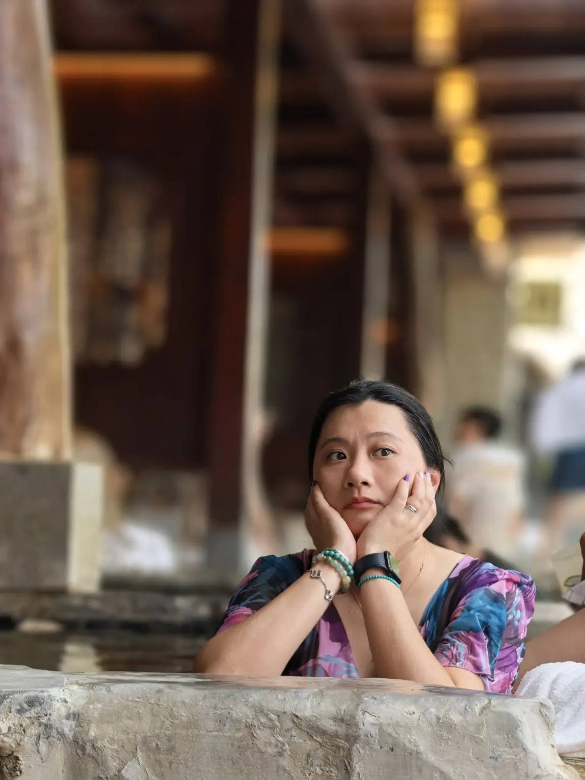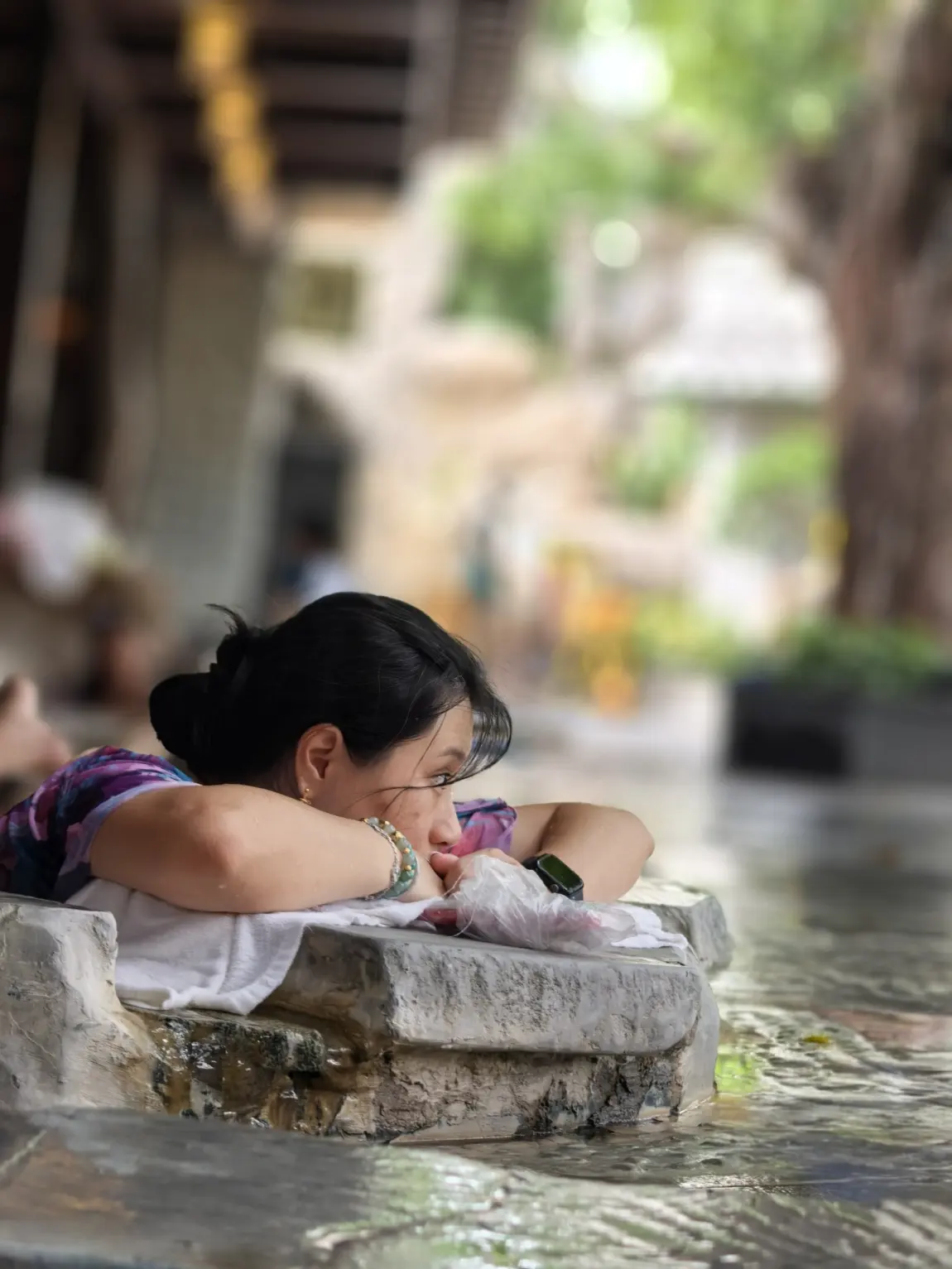 我们先去了心心念念的温泉区。不同功效的汤池错落有致,我最爱的是那个“醋窑”,据说有美容养颜的功效。坐在池边,让温热的泉水漫过脚踝,所有的疲惫都烟消云散。