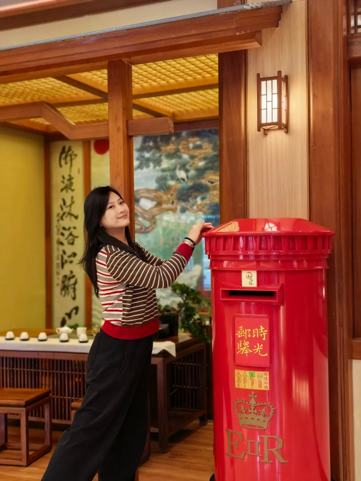 - 充满复古风情的红色邮筒,旁边是中式风格的木质隔断和松枝装饰,中西合璧的美感,让每一张照片都充满故事感。