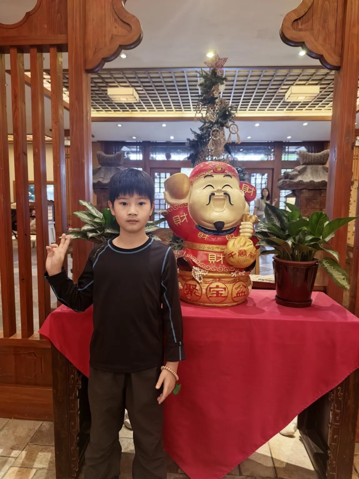 - 还有那个憨态可掬的财神像,孩子站在旁边比出“OK”的手势,仿佛在说“新的一年,万事OK”。