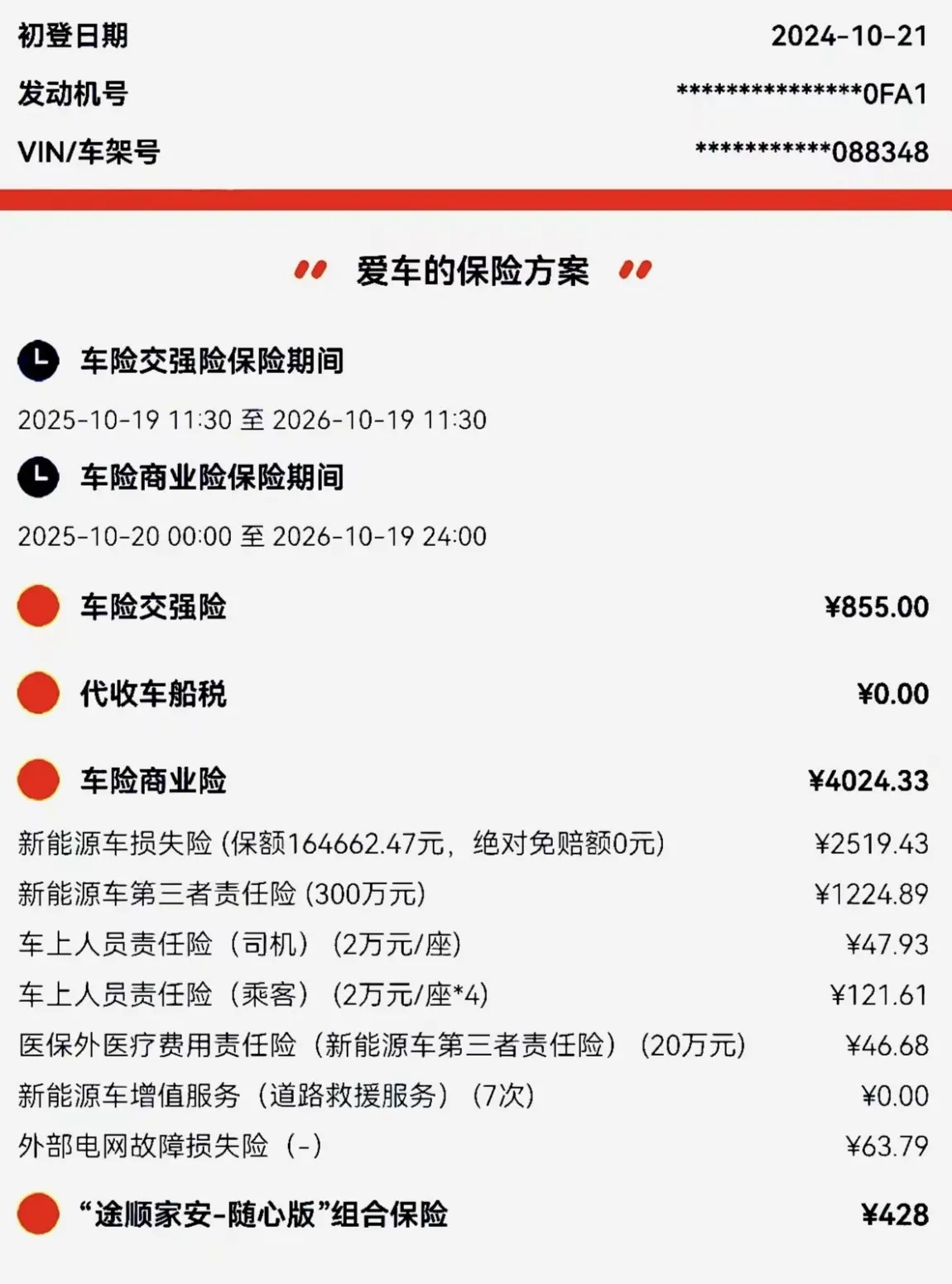 1-保险。交强险855元;商业险4024.33元(三者买的是300万),途顺家安随心版428元是赠送的,保险合计4875.33元。