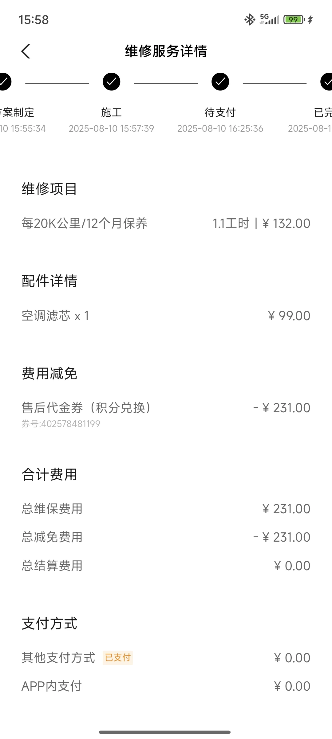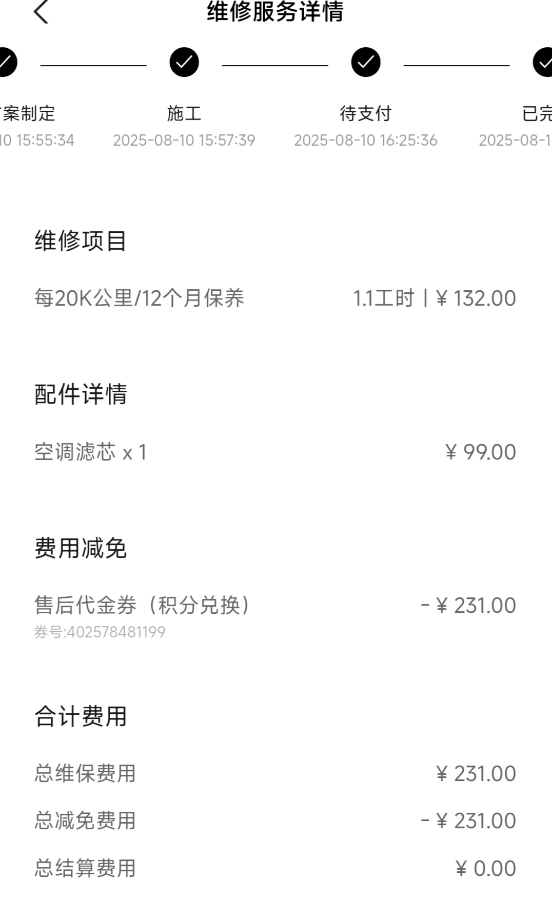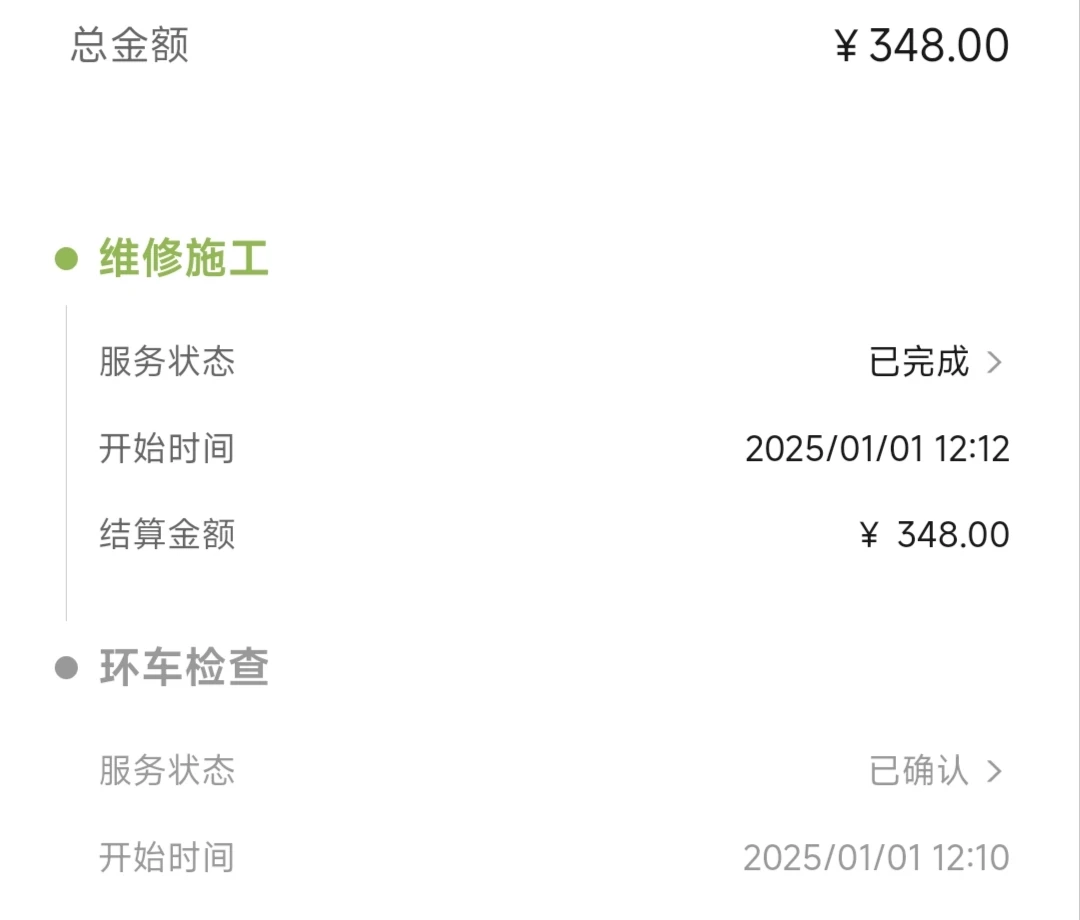 3-维保。保养共2次,首保免费,二保231元(使用积分抵扣)。维修共2次,1次喷漆348元(积分抵扣),1次事故11166元(保险支付,连续三年保费上涨,成本大约3000元)。洗车没花一分钱,要么维保时在4S店洗,要么自己动手洗车,在商城买了洗车水枪,yyds。